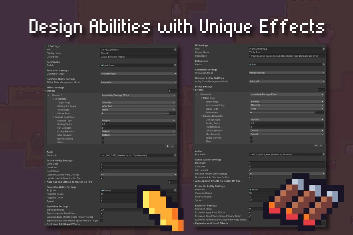 - Abilities and Effects: Mythril2D features an ability system that supports dozens of customizable effects. These can be assigned to both heroes and monsters to define combat variety.