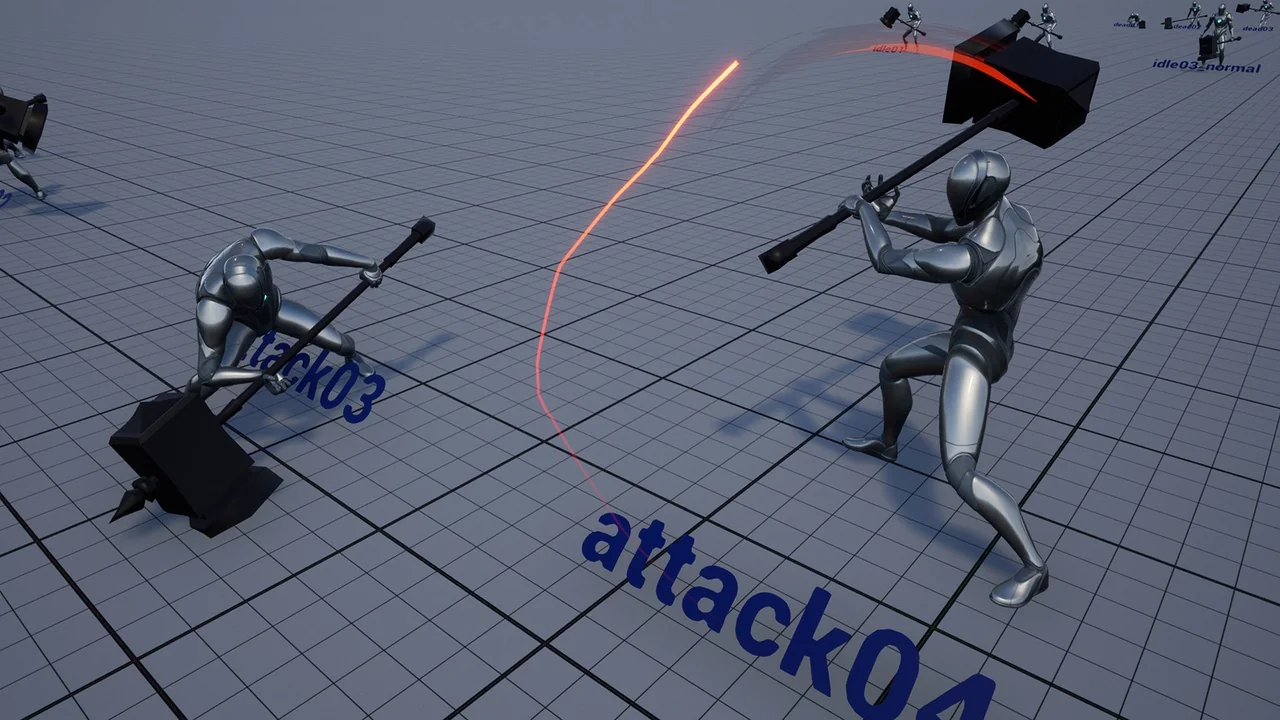 That spread matters for heavy-weapon gameplay. A large hammer or axe is not only about the strike itself; the fight also needs the steps that lead into the strike, the turn that lines it up, the dodge or roll that changes position, and the hit or down states that show what happens when a character takes damage. The included combo clips make repeated offense feel like part of the same motion language rather than isolated swings.