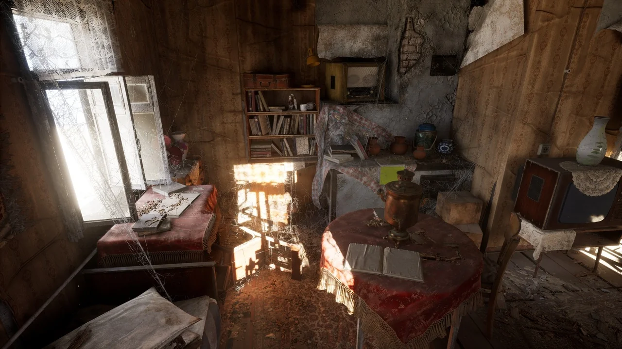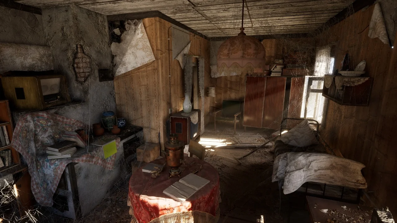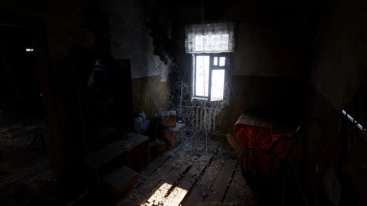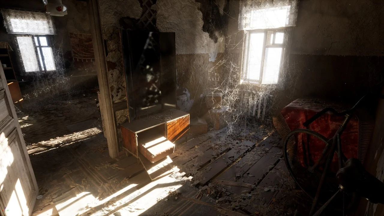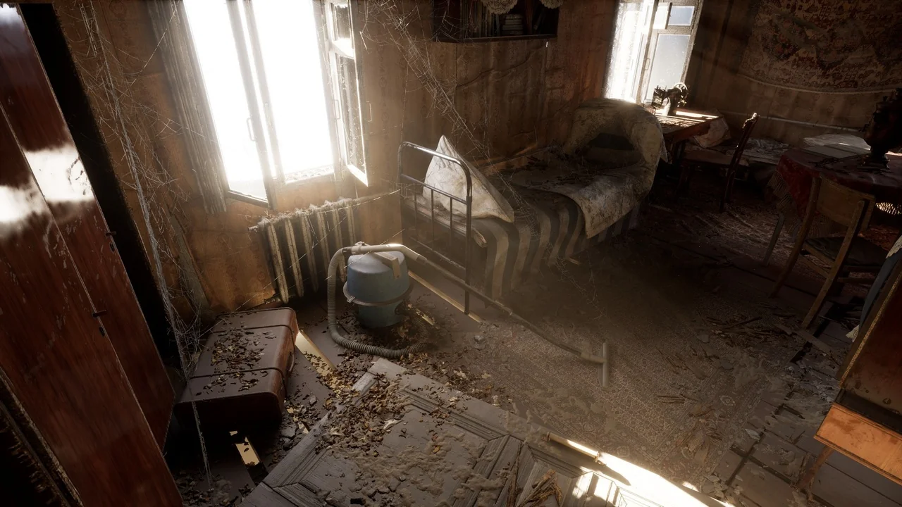 The design focuses on a specific aesthetic. It features cracked wallpaper and plastered walls. In addition, the heating system is visible and aged. These details contribute to a realistic Soviet-style or fantasy setting. Therefore, the environment feels authentic and grounded in reality. Every corner of the house shows signs of damage and wear.