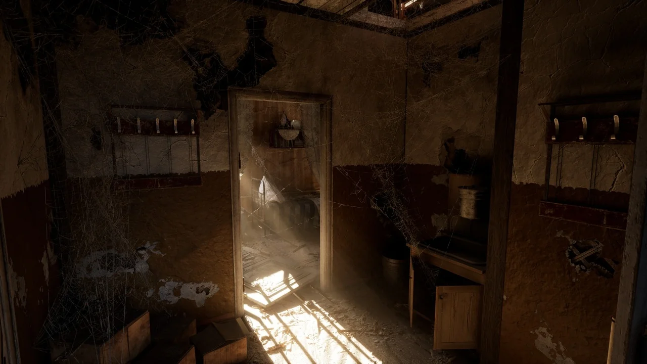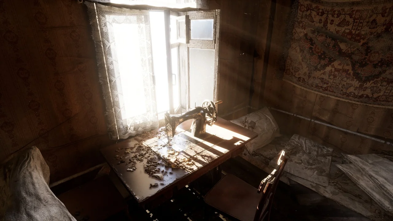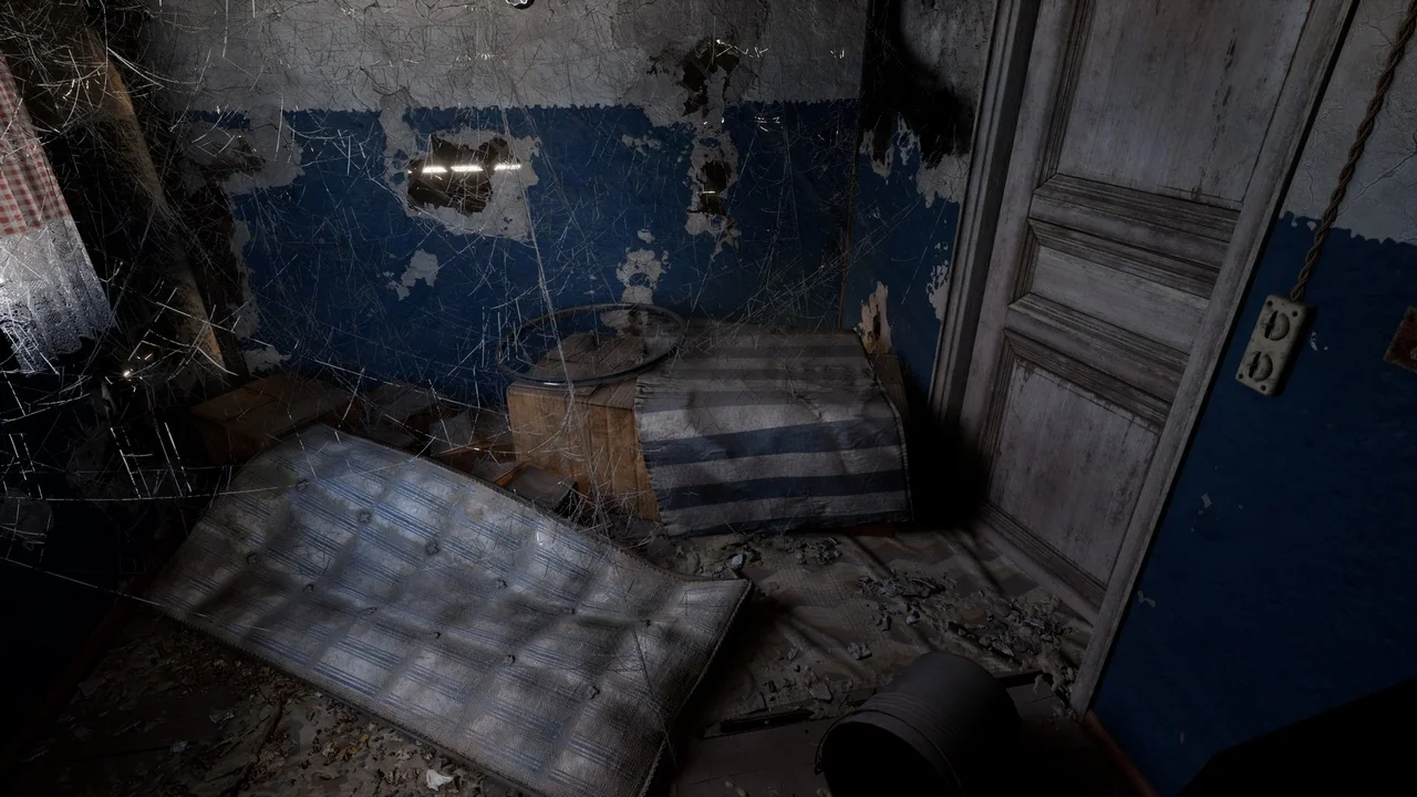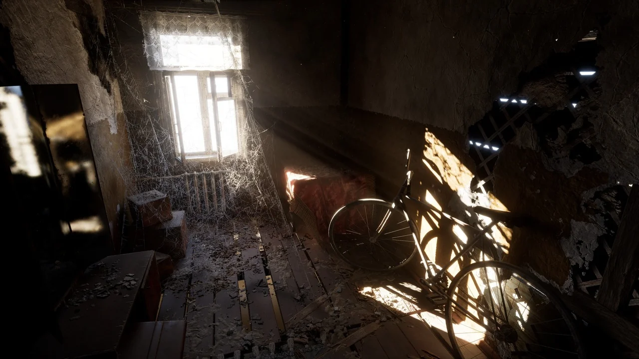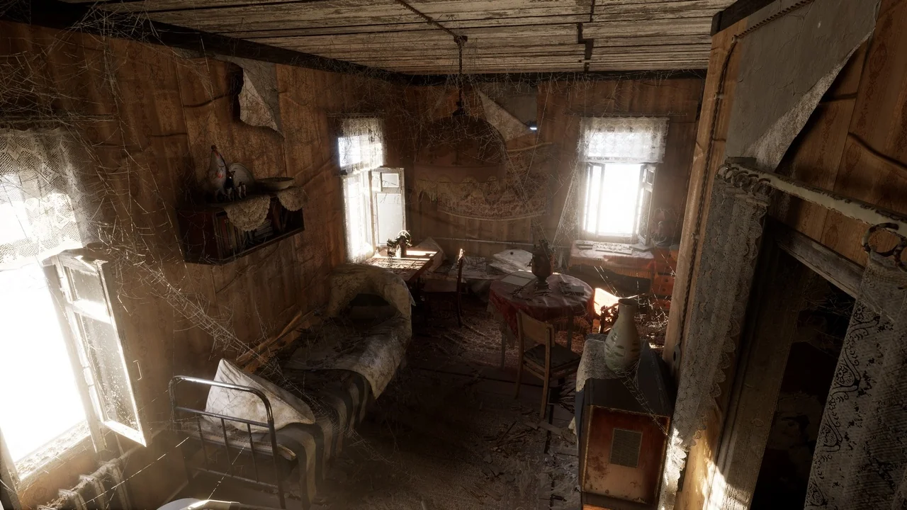 The design focuses on a specific aesthetic. It features cracked wallpaper and plastered walls. In addition, the heating system is visible and aged. These details contribute to a realistic Soviet-style or fantasy setting. Therefore, the environment feels authentic and grounded in reality. Every corner of the house shows signs of damage and wear.