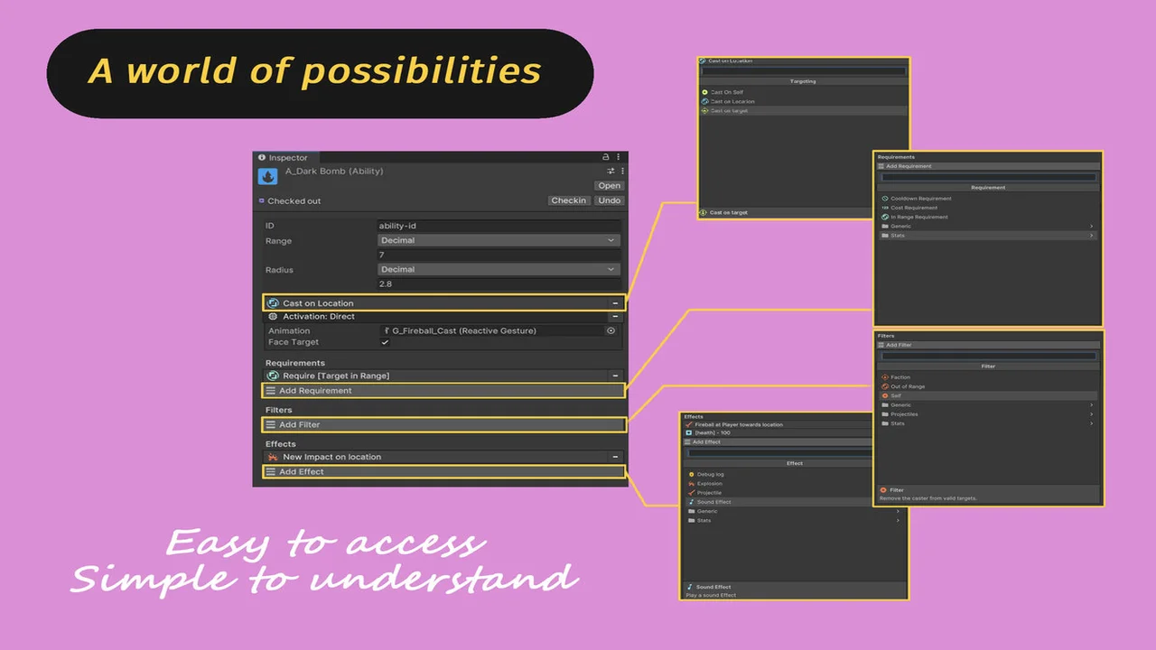 Abilities is designed with simplicity and flexibility in mind. No need to code, you can add your custom logic directly in the inspector with simple instructions to quickly prototype your ideas.