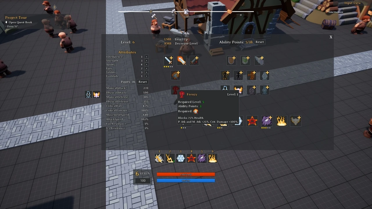 • Abilities – 17+ parameters | Active and Passive | Level and Level Up Requirements | Activation Policy | Interruption Policy | Cooldown, Cost, Charges | Frontal Block | Dash | Sprint | AoE and Target | Casting Bar | Select Area