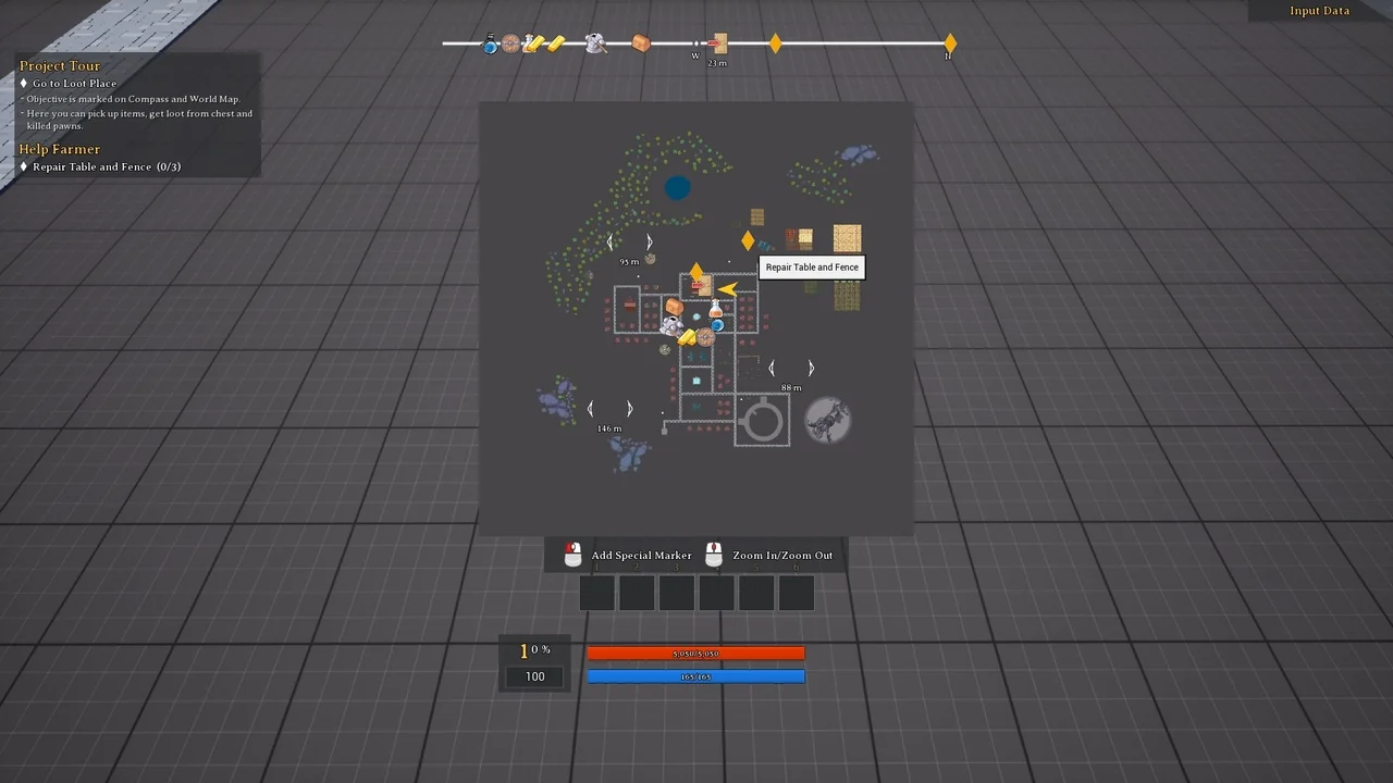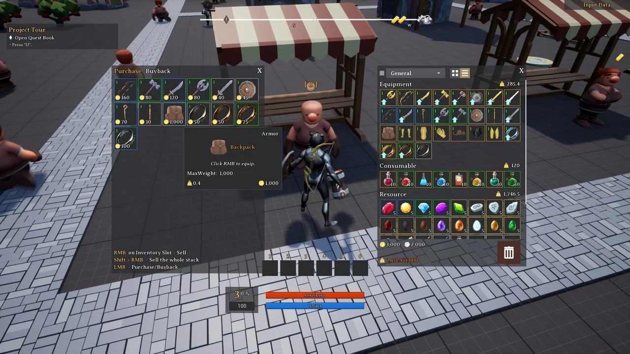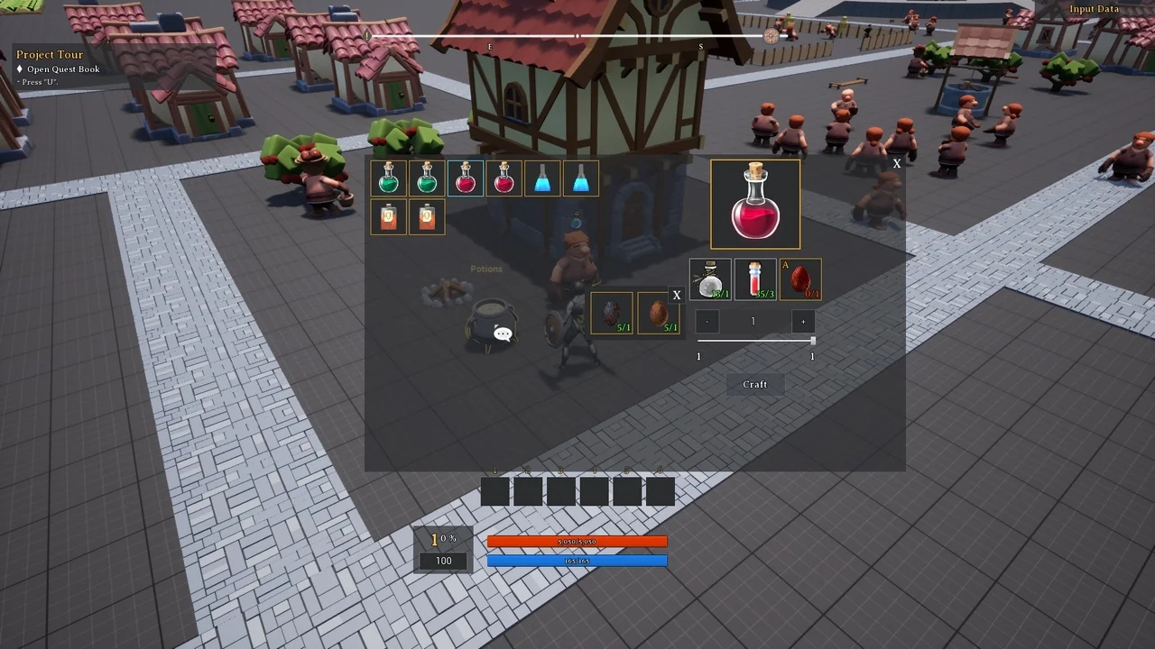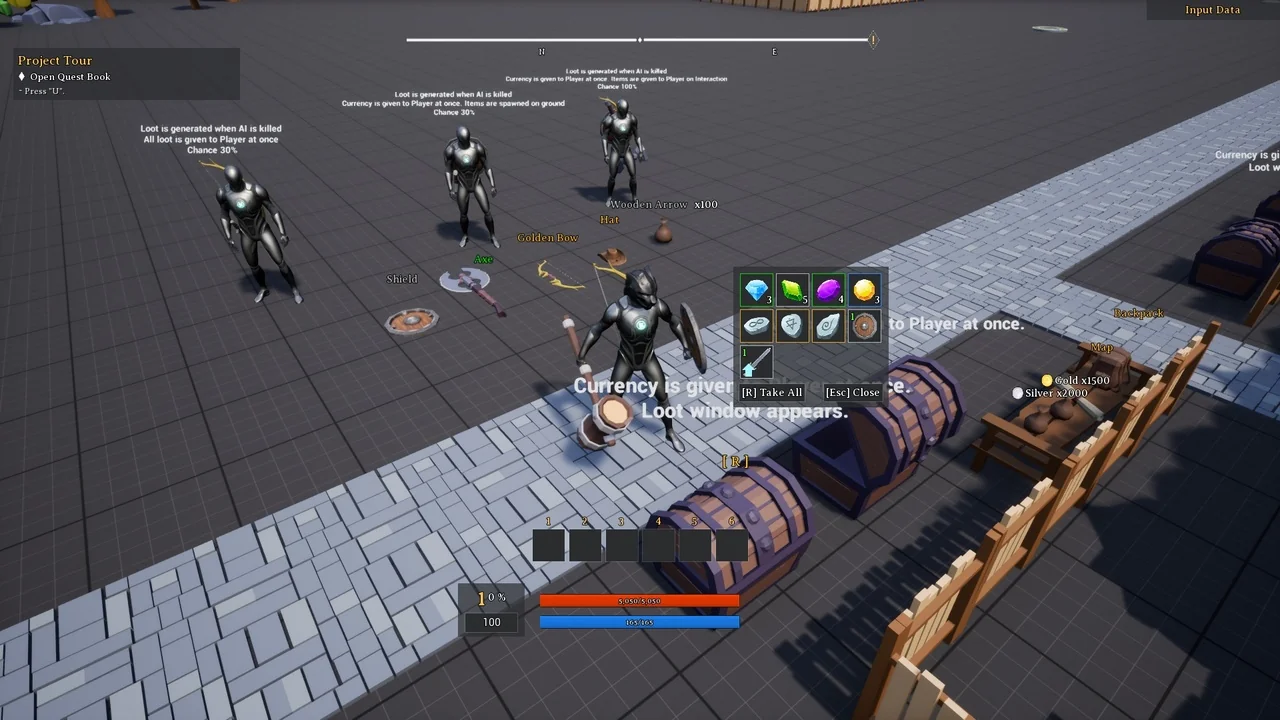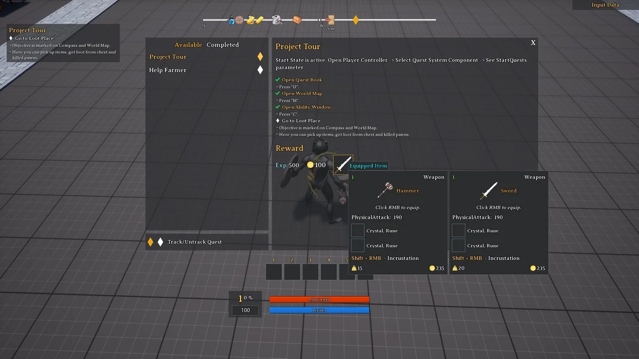 The Action RPG Template includes a powerful quest system for narrative-driven games. It supports quest chains where completed or failed tasks trigger new events. Objectives vary from gathering items and killing enemies to discovering new locations. To assist the player, a track system provides a compass, world map, and mini-map. Finally, a Quest Helper utility is included to help developers check actor bindings and quest statuses within the game world.