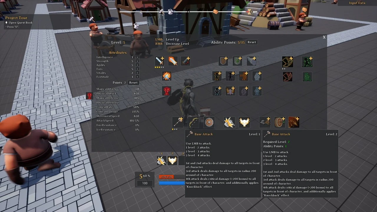 Customization is a core strength of the Action RPG Template. The ability system features over 17 parameters, covering both active and passive skills. Similarly, the effect system includes more than 29 parameters for complex gameplay logic. You can manage health, stamina, and attack power through a detailed attribute system. These attributes can affect one another and support regeneration mechanics. Moreover, the system includes level-up requirements, cooldowns, and frontal blocking logic.