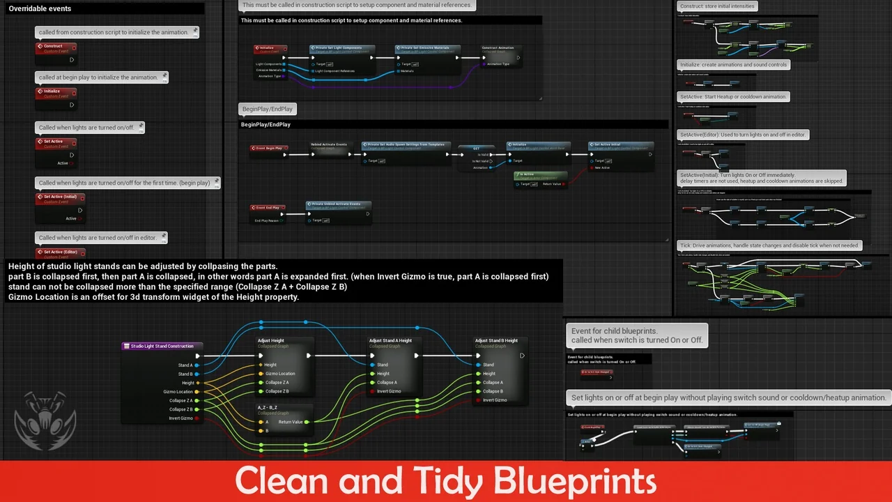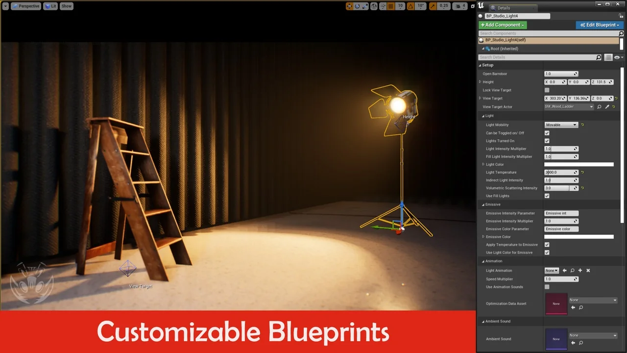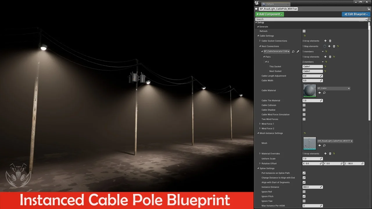 The pack offers deep technical control over lighting behavior in real-time. For example, it supports real-time view targets and animation changes for all light actors. Users can also toggle cast shadows and raytraced shadows for key and fill lights. Additionally, the cables include a simple wind simulation for added environmental realism. The pack is further supported by 2 master materials and 13 material instances.