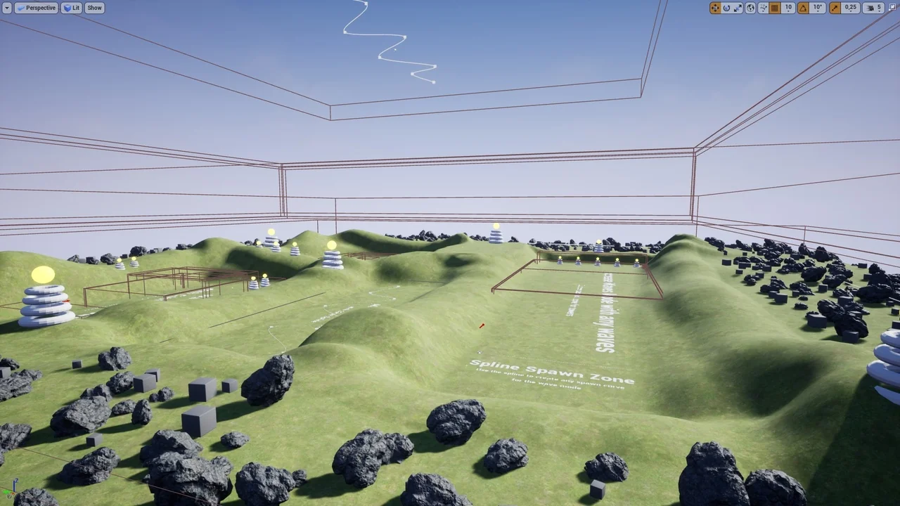 The package supports three spawn shapes: spline, sphere, and box. That gives the spawner three different ways to define placement. A spline can follow a path, while sphere and box setups give more enclosed spawn areas. The same system handles four kinds of spawn objects: