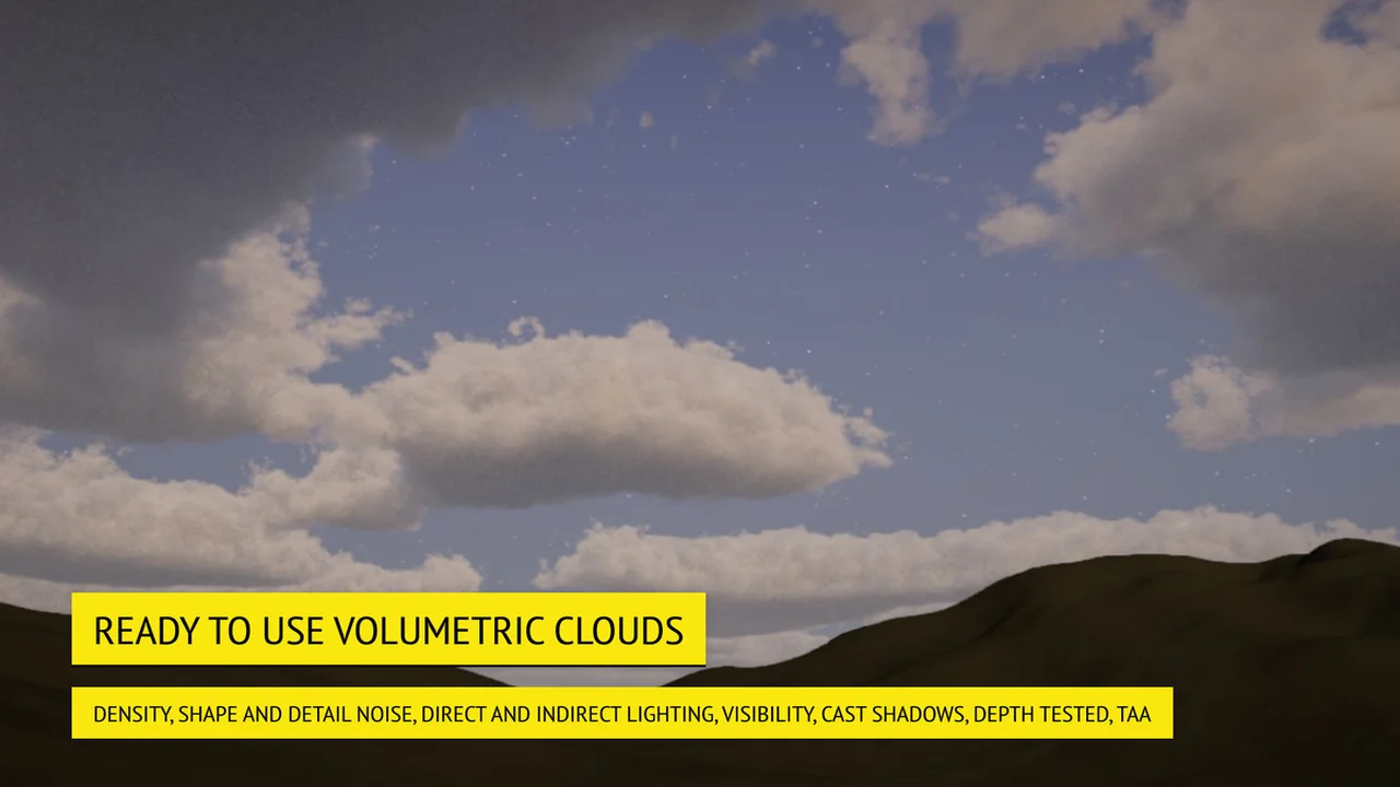 • Help your game come to life with our integrated weather simulation. Clouds zip across the sky. Our lightweight weather simulation sells your dynamic sky. Or, you can take weather control with a configurable Weathermap. Want your volumetric clouds in the shape of a flying star? If you can dream it, you can make it.