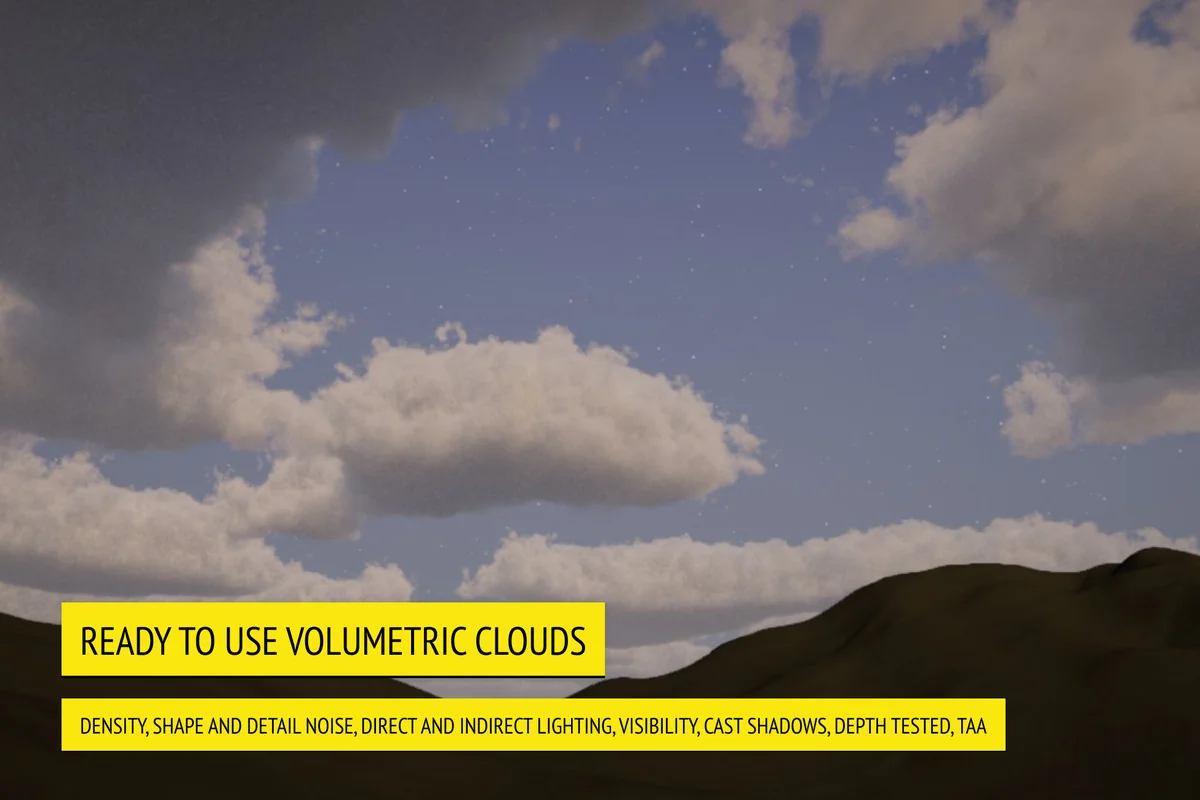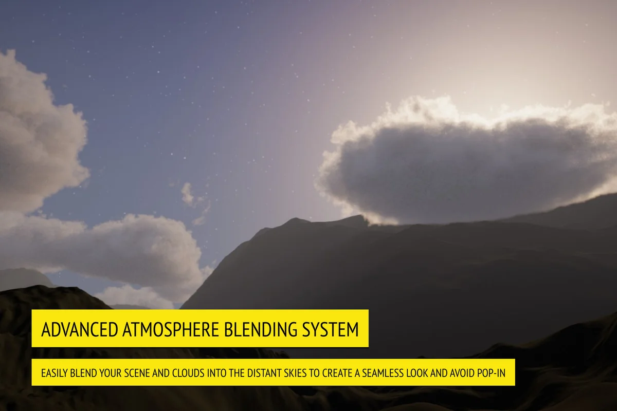 The cloud system is one of the main points of the asset. The clouds are described as dramatic, animated, and able to blend into atmospheric fog. They are not limited to a single look either. The sky can shift from cloudy atmospheres to desert skies in seconds, which gives a project room to move between moods and locations without replacing the whole sky setup.