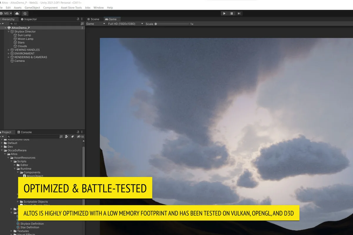Altos is strongest in projects where the sky needs to do more than fill empty space. It brings together volumetric clouds, a dynamic skybox, fog, lighting, a day-night cycle, and weather simulation in a single Unity URP package. That combination makes it useful for worlds that need to feel immersive from a distance and still hold up when the player looks upward, travels across terrain, or moves through changing weather and time.