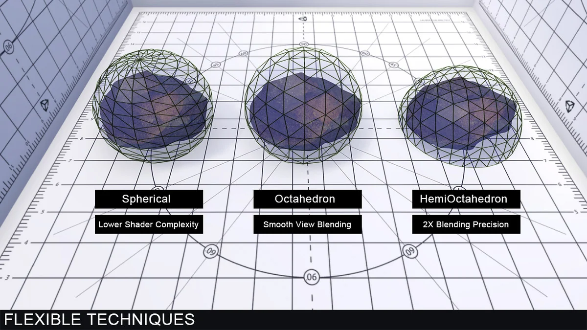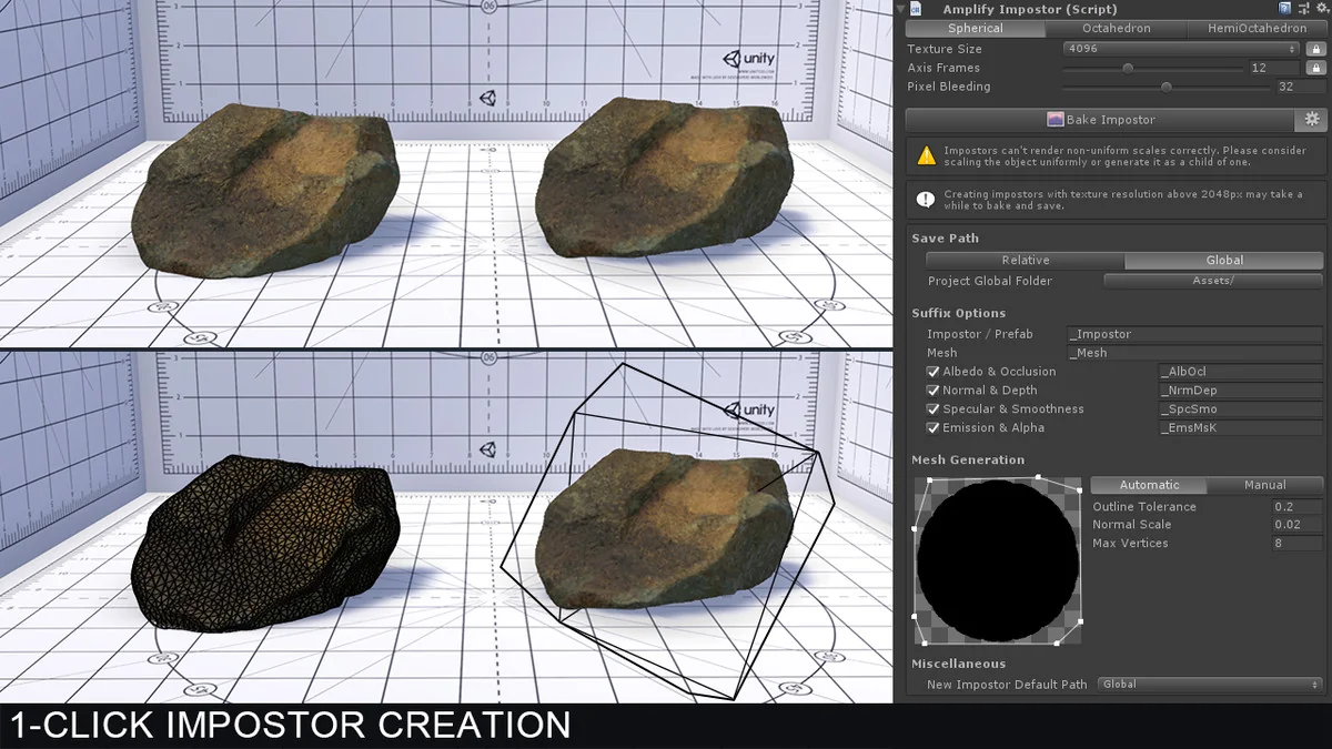 Amplify Impostors centers on a practical version of the billboard technique: it builds geometrically simplified, volumetrically accurate representations of complex models. The workflow starts with 1-Click Baking and branches into a set of controls that keep the result useful in real scenes rather than just visually reduced. Octahedron Impostors and Spherical Impostors give it more than one impostor style to work with, while the Billboard Shape Editor lets the shape itself be adjusted instead of forcing a single flat treatment.