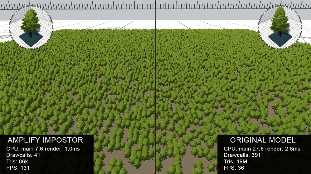 Hardware Instancing is part of the feature set, and Dithered LOD Cross-Fade helps them fit into LODGroup workflows. The result is a resource that works as part of a broader scene setup rather than as a separate special effect. A recent update also improved impostor shadowing and surface intersections, fixed impostor picking across the board, and increased the maximum axis frames from 32 to 64. Those changes make the impostors more dependable when they are used as visible replacements for heavier geometry.
