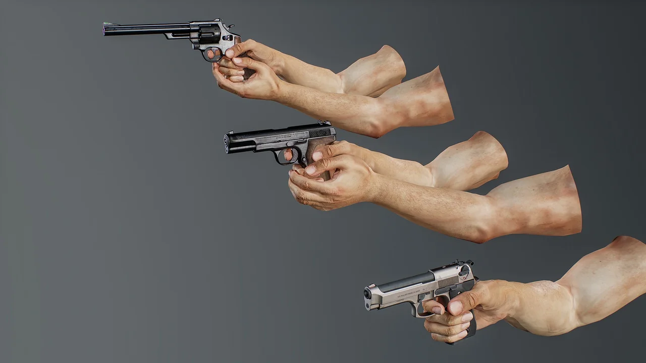 Alongside the pistols, the pack includes a new VFX muzzle flash and first-person arms that are fully rigged and animated. That makes the set more complete than a weapon model alone. The firearm, the firing effect, and the arms that hold the weapon are all present in one place.
