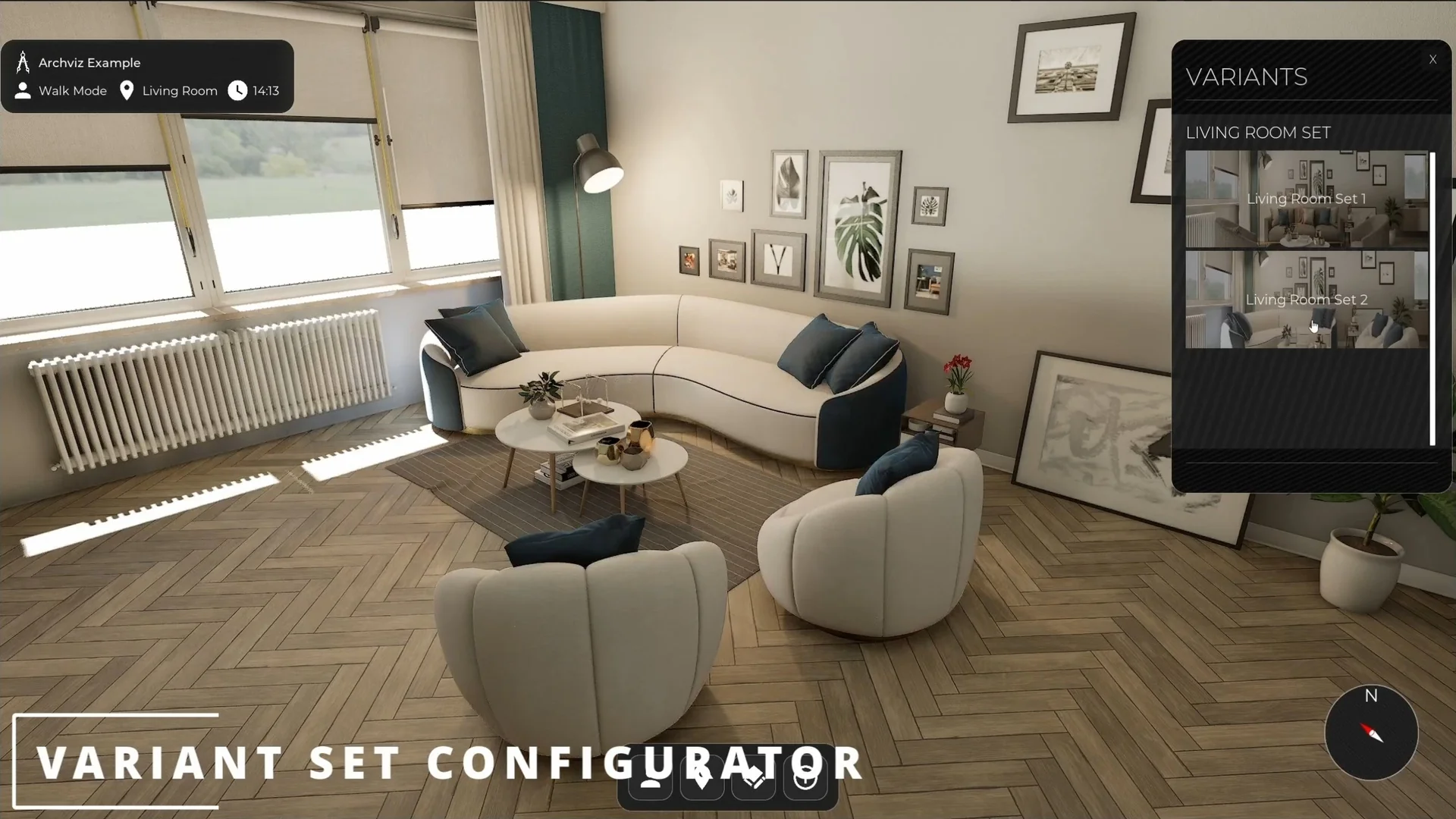 The interactive variant system lets clients swap materials and meshes in real time. Floor options, wall colors, and furniture layouts are the most obvious ways to use it, but the setup is broad enough to support other presentation-driven changes in a scene.