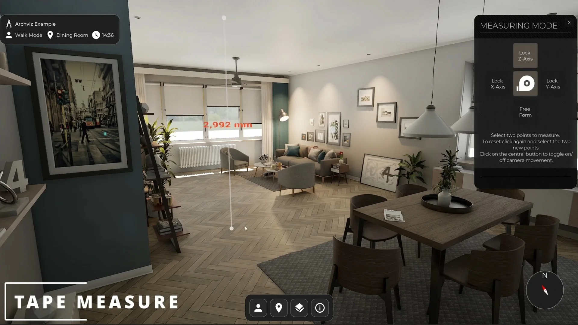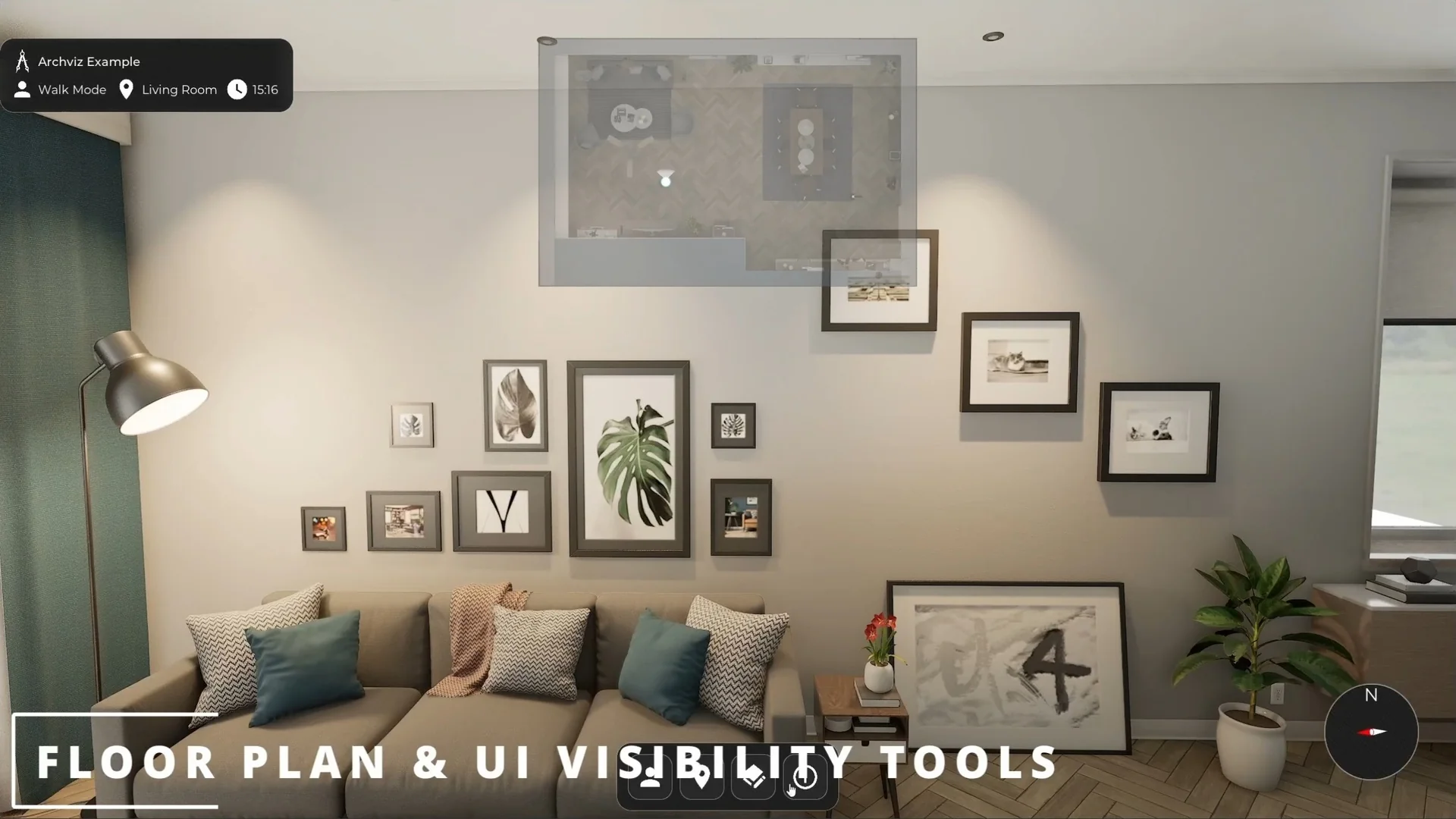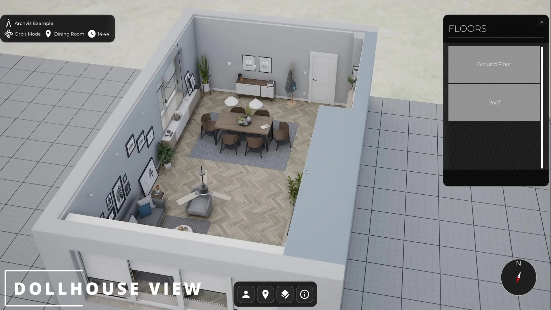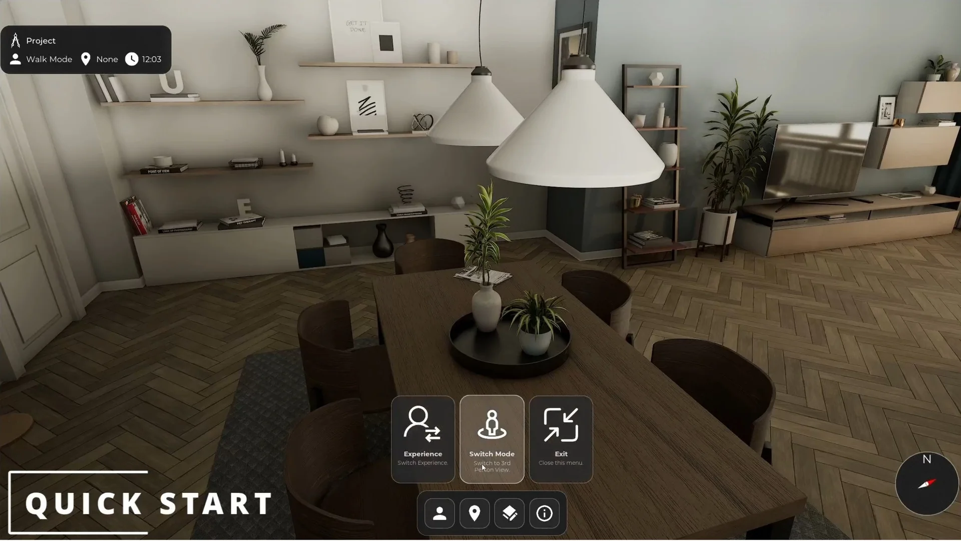 Navigation is one of the strongest parts of the template. It includes first-person, third-person, drone, orbit, and orthographic modes, so the same project can support close walkthroughs, broader overviews, and more controlled presentation angles.