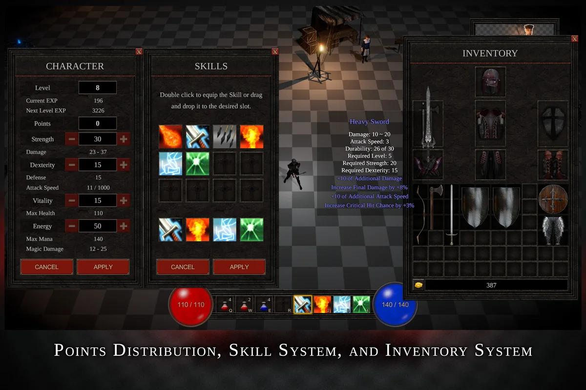 Progression is handled through a level and experience system, where players can distribute stat points to customize their character’s capabilities. The resource also includes a variety of item types, such as consumables, collectibles, and loot drops from defeated enemies or destructible objects.