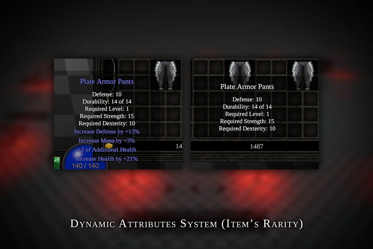The project features a grid-based inventory system equipped with an auto-sort function to streamline item management. Items are defined by dynamic attributes and include a durability system, requiring players to monitor the condition of their equipment. The armor system is integrated with character visuals, allowing appearance changes based on the items equipped. In addition to player inventory, a stash system is included for long-term item storage.