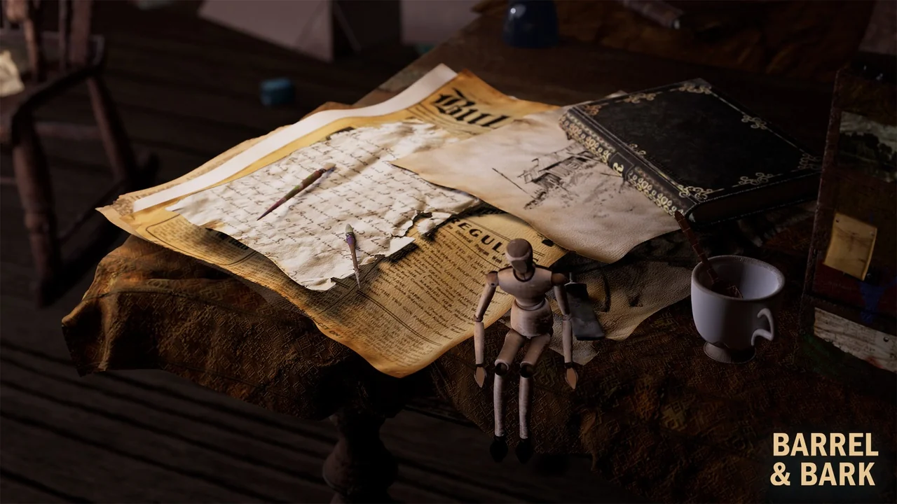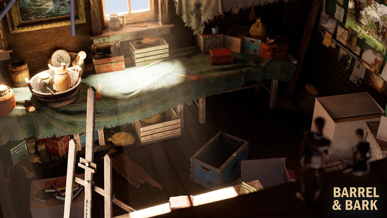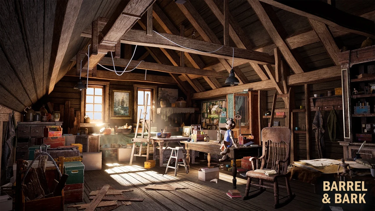 A carefully composed lighting setup gives the attic a natural daylight mood. That matters here because the room is meant to feel warm and readable at the same time. The lighting supports the atmosphere without overwhelming the set dressing, letting the wooden structure and studio props stand out clearly.