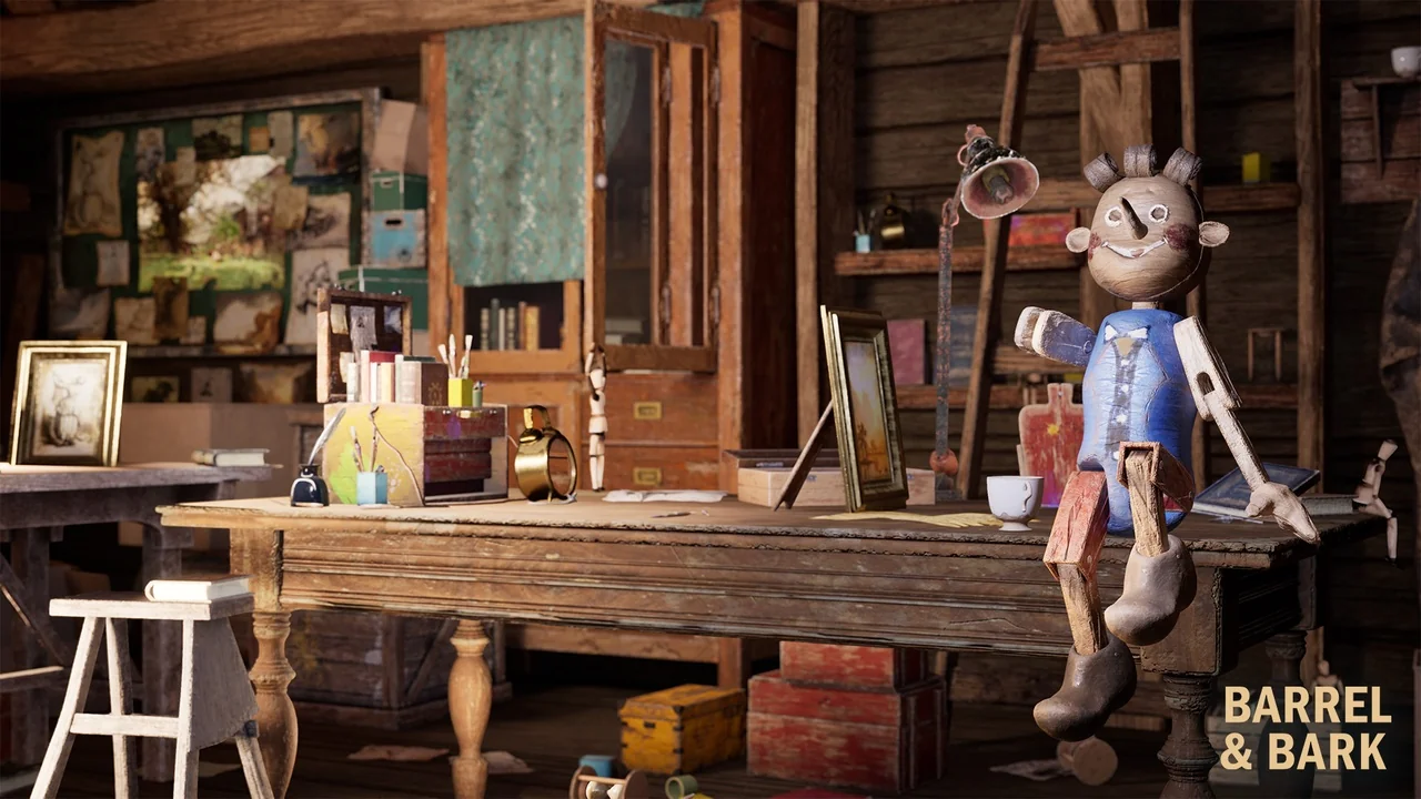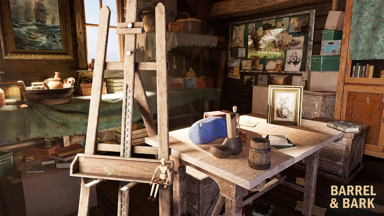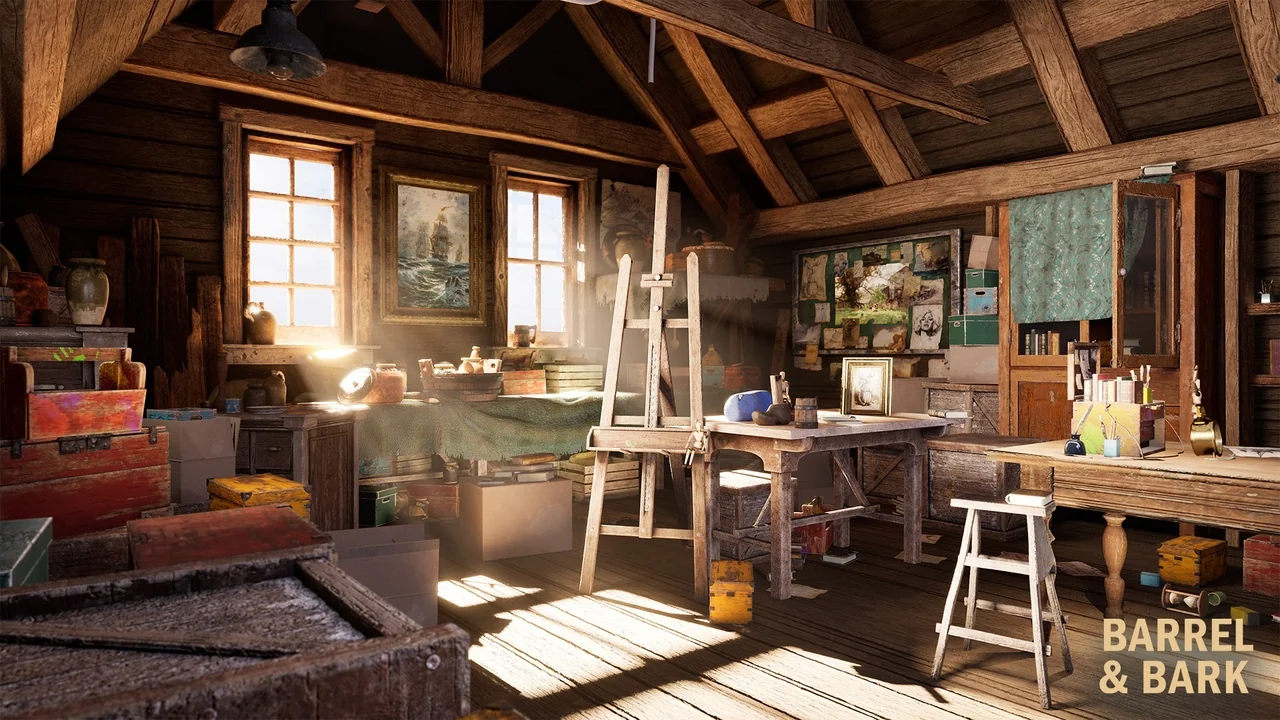 The attic is not left bare. It includes artist props such as desks, chairs, shelves, books, boxes, paintings, and clutter. Those items do most of the storytelling work. They turn the space into a studio with signs of use, where the environment feels active and personal instead of empty.