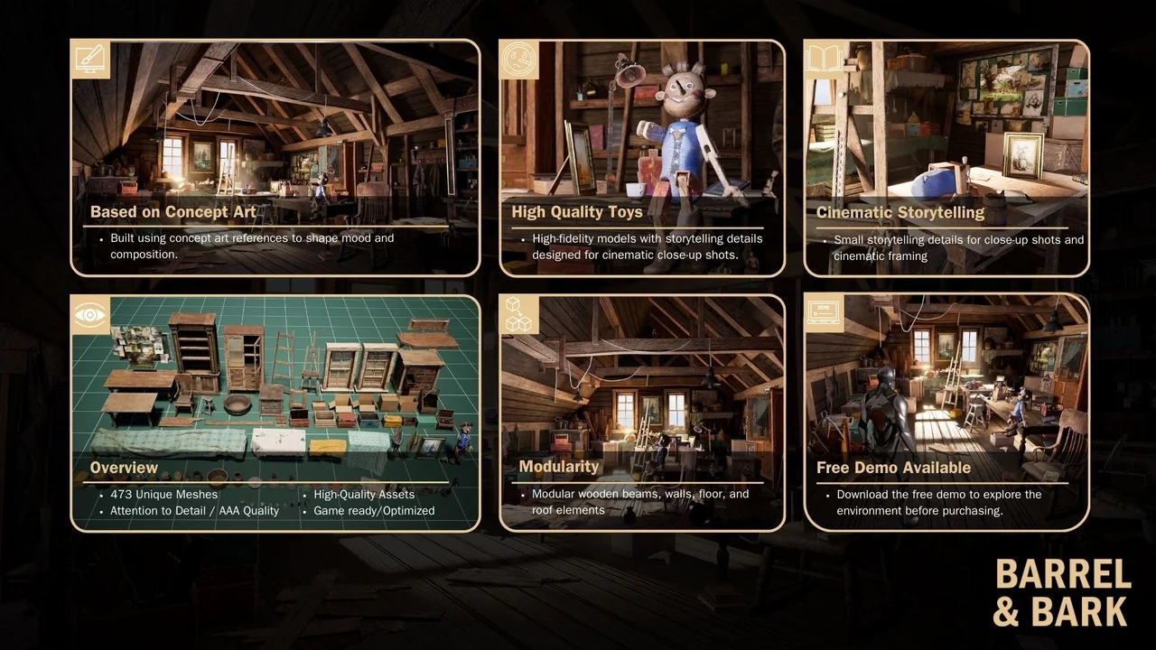 This is a game-ready environment that fits both cinematics and gameplay. It is also described as Unreal Engine friendly, with a setup that is ready to drop into a project. That makes it a strong choice for teams that need an interior to move from scene layout into a working build without turning the attic into a separate reconstruction task.