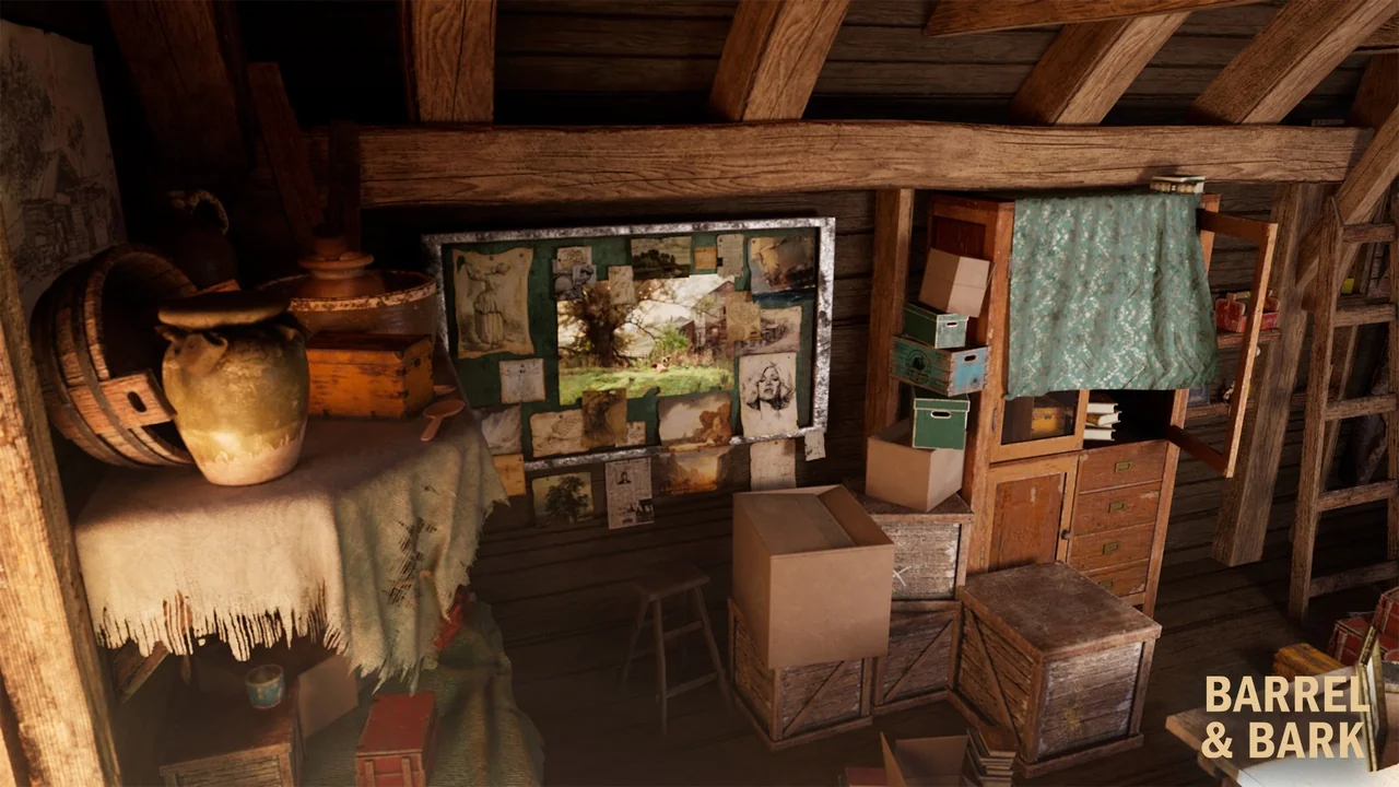That dressing is especially helpful for close-up shots and cinematic framing. A desk can anchor the foreground, shelves can help break up the composition, and the books, boxes, paintings, and clutter add details that reward a closer camera. Small objects matter in a room like this because they keep the scene from reading as a simple architectural space. They give the attic the kind of lived-in character that makes a shot feel grounded.