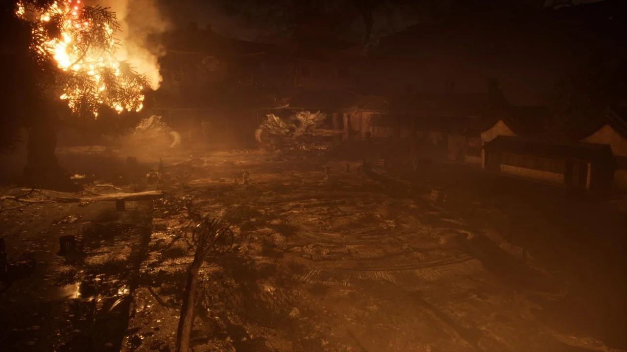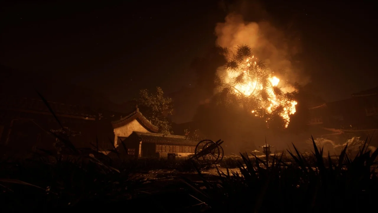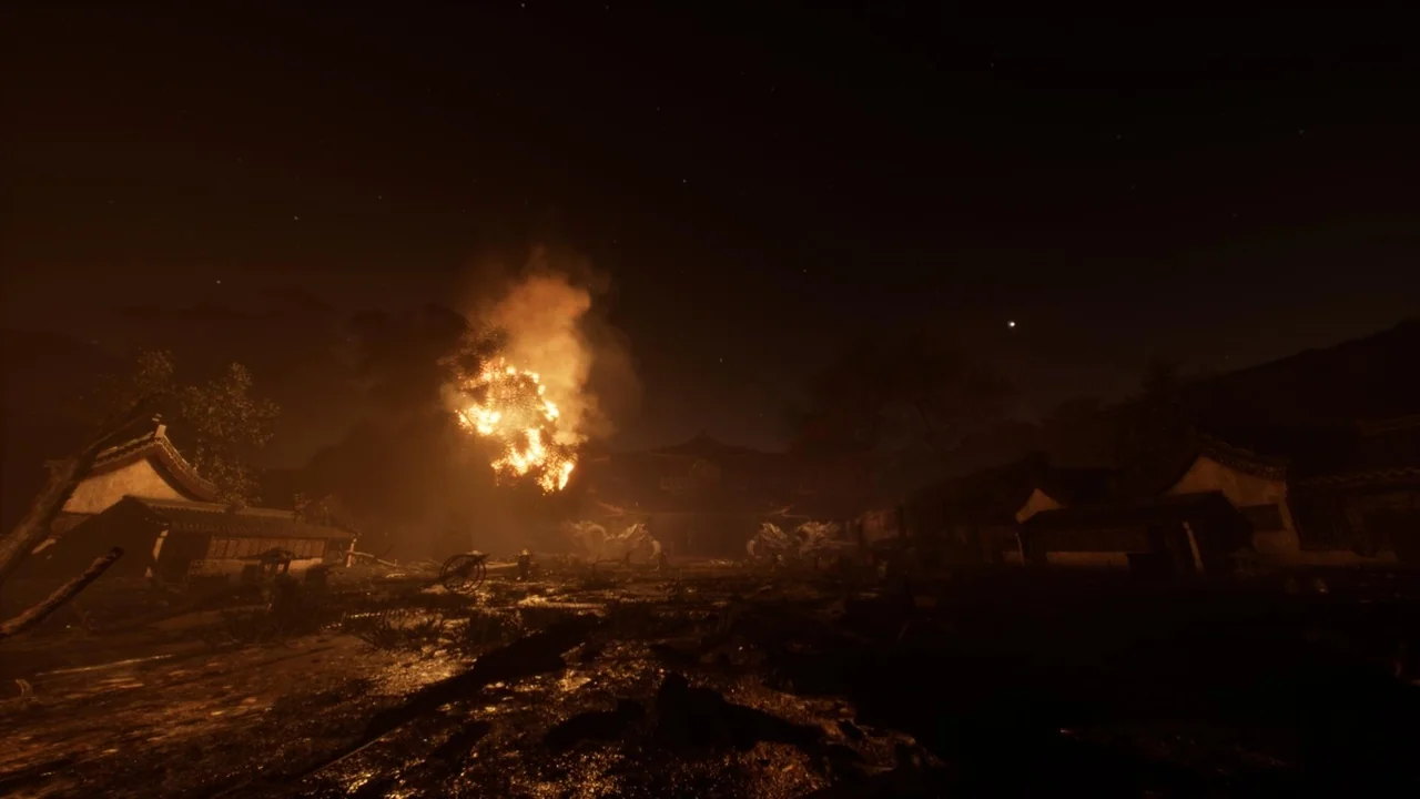 Village and arena suggest a place with environmental context, while burned, burning, and fire make the condition of the scene impossible to miss. Fighting, stage, and level place it firmly in a gameplay or encounter context. Fantasy leaves room for stylization, and the Japanese, Japan, Asian, China, and Chinese tags reinforce a broad regional direction rather than a neutral or generic location.