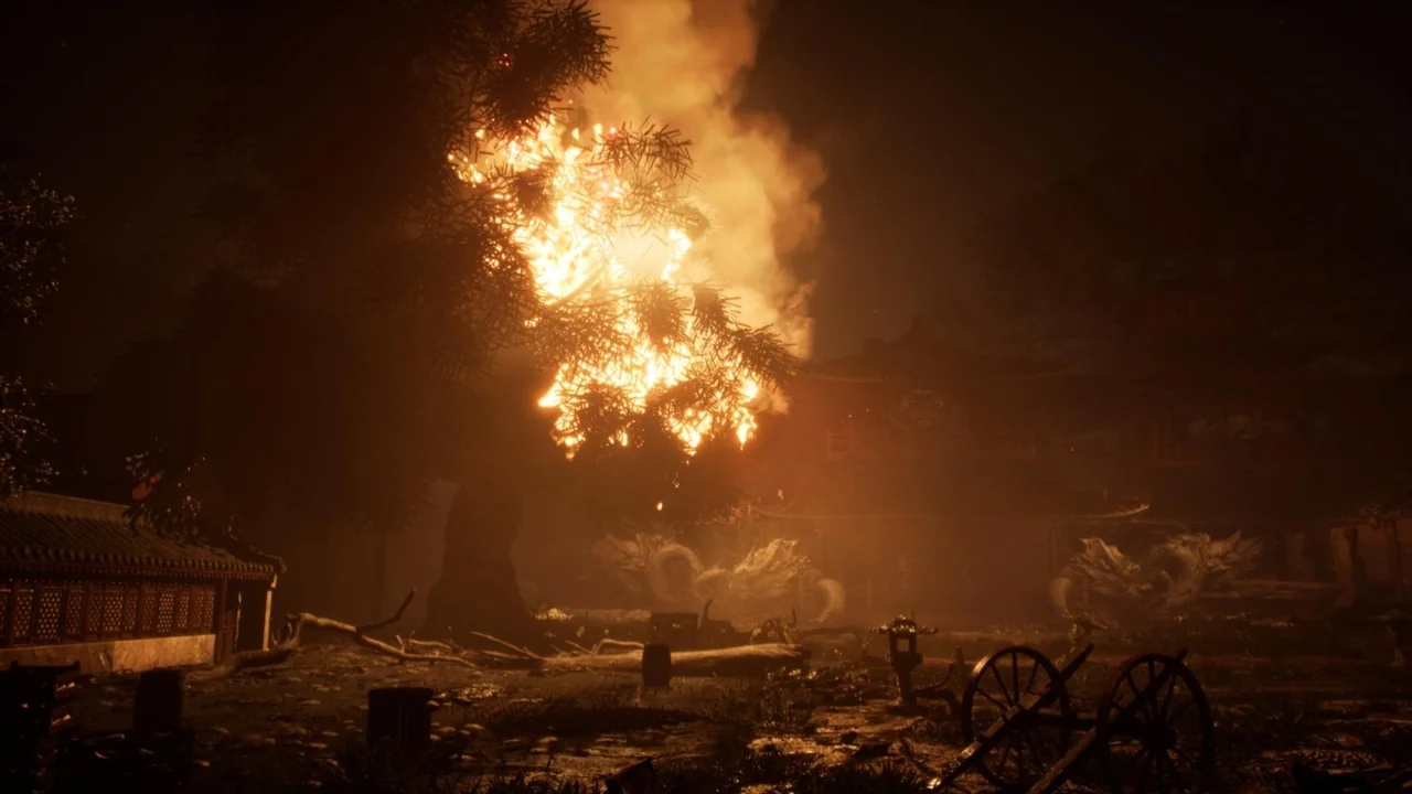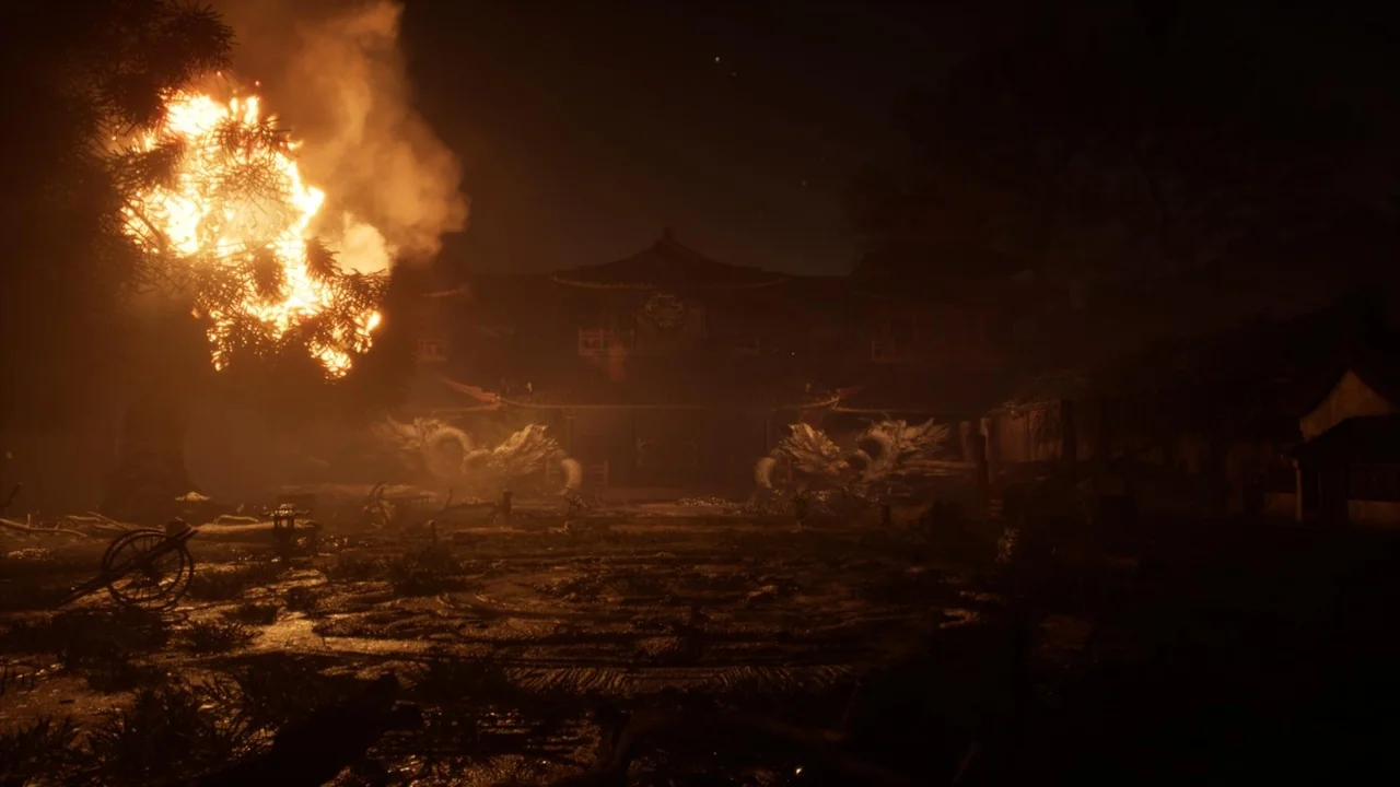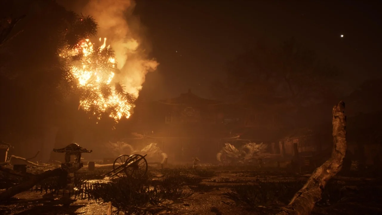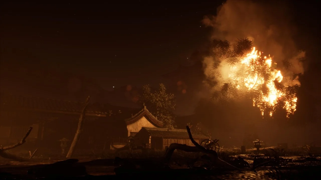 Village and arena suggest a place with environmental context, while burned, burning, and fire make the condition of the scene impossible to miss. Fighting, stage, and level place it firmly in a gameplay or encounter context. Fantasy leaves room for stylization, and the Japanese, Japan, Asian, China, and Chinese tags reinforce a broad regional direction rather than a neutral or generic location.