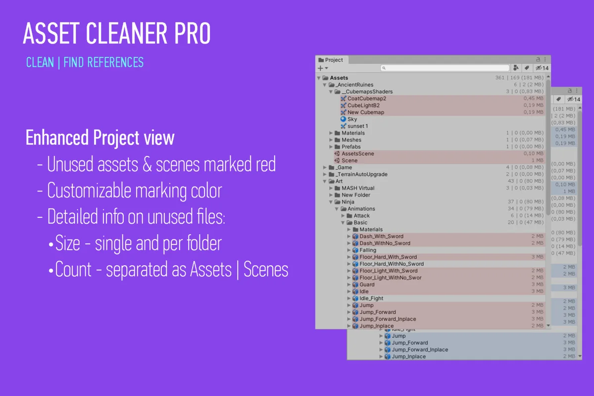 The Project Cleaner side uses a non-distracting UI that works best when docked, which makes it easier to leave open while working in the Unity editor. Inside the enhanced Project view, unused files are marked red, folders show counters for unused assets and scenes, and both folders and files can display the size of those unused items. Editor Dark skin support is included, so the view remains readable in darker editor setups.