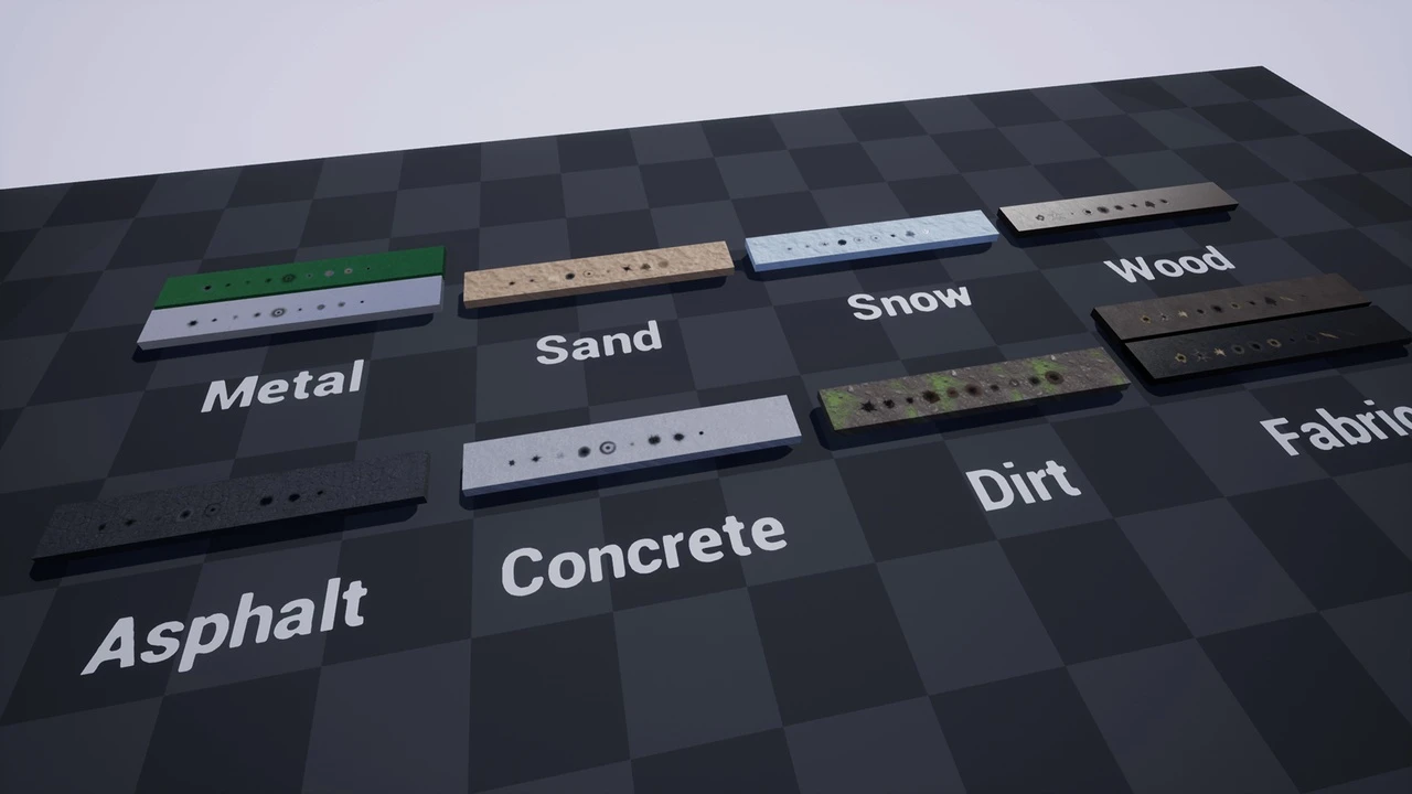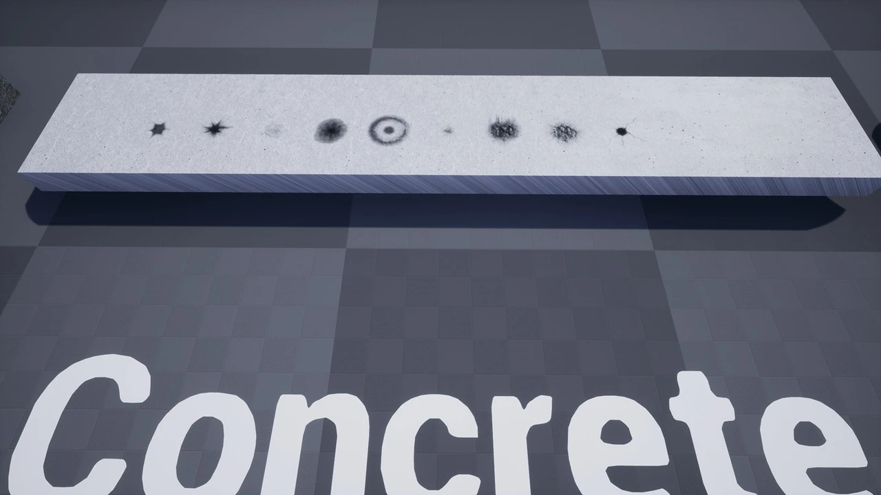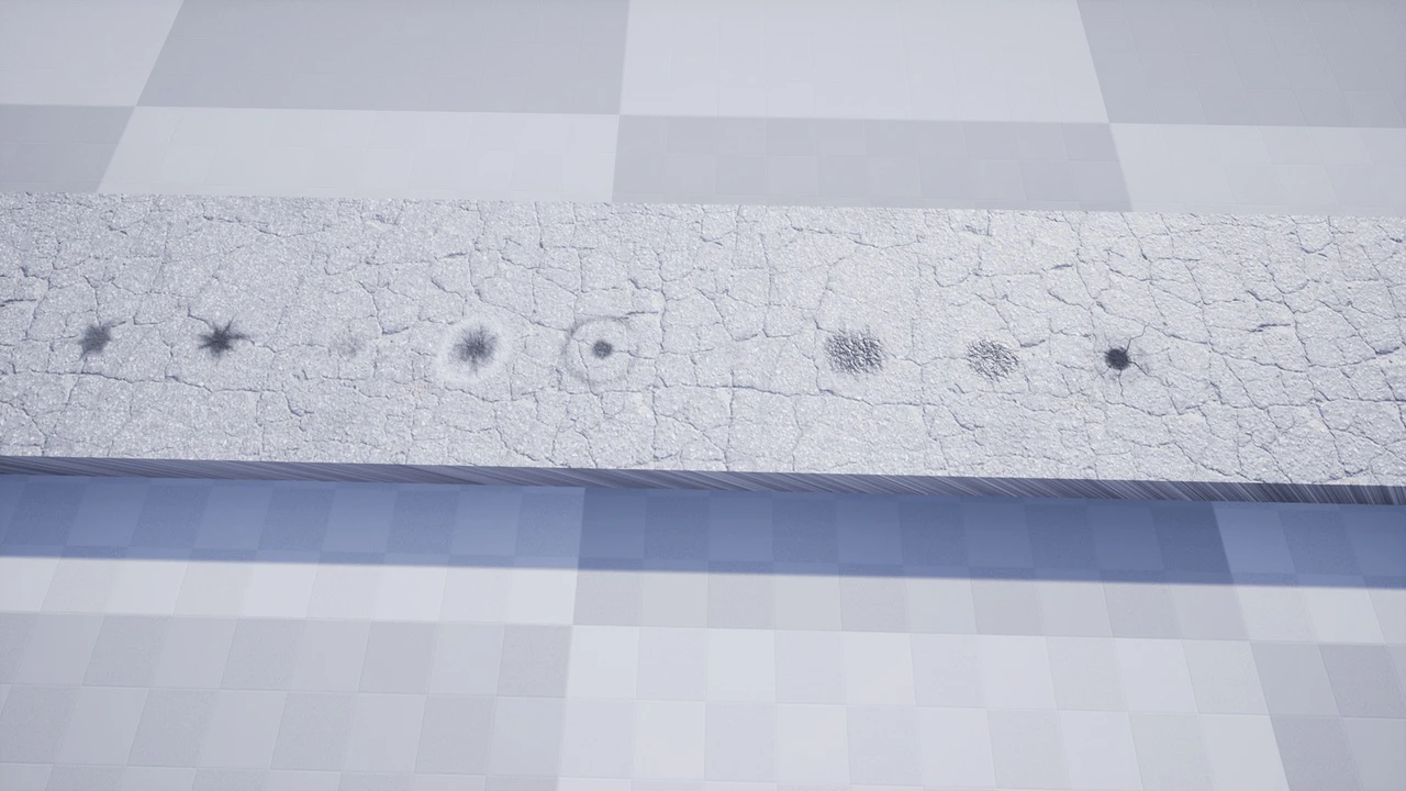 This pack contains 80 decals for damaged surface effects on various types of surfaces. These include blast damage, holes, shell impacts, shattered surfaces, glassed sand, and torn body armor.