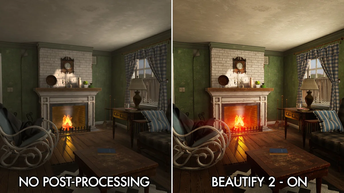 Beautify 3 – Advanced Post Processing applies as a full-screen image post processing effect, so it changes the look of the entire frame rather than a small isolated element. Its core enhancement algorithm is meant to improve image quality in real time, giving scenes a crisper and more vivid presentation while also restoring or augmenting image detail.