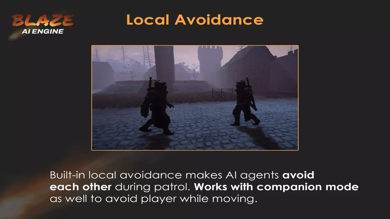 - A built-in local avoidance comes with Blaze that enables the AIs to avoid each other without colliding as best as they can while navigating. This avoidance also functions during companion mode, allowing the companion AI to avoid the player.