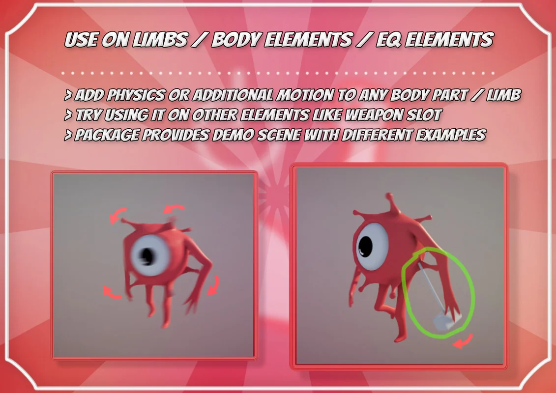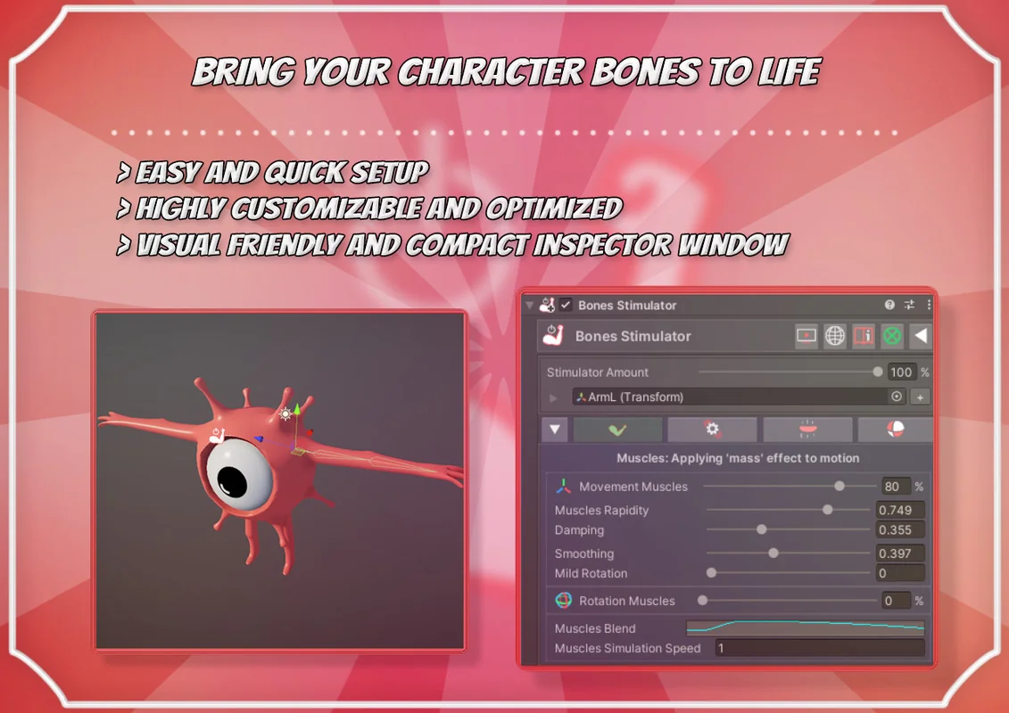 Bones Stimulator is a dedicated component for Unity designed to layer procedural motion on top of existing keyframed animations. The tool functions by adding secondary rotation, position, and scale movement to specific bones within a 3D model’s hierarchy. This additive approach is intended to improve the overall feeling of character movement or to introduce entirely new motion to specific body elements for creatures and humanoids. By simulating muscle-like behaviors, the tool helps animations appear more natural by reacting dynamically to the primary animation data.