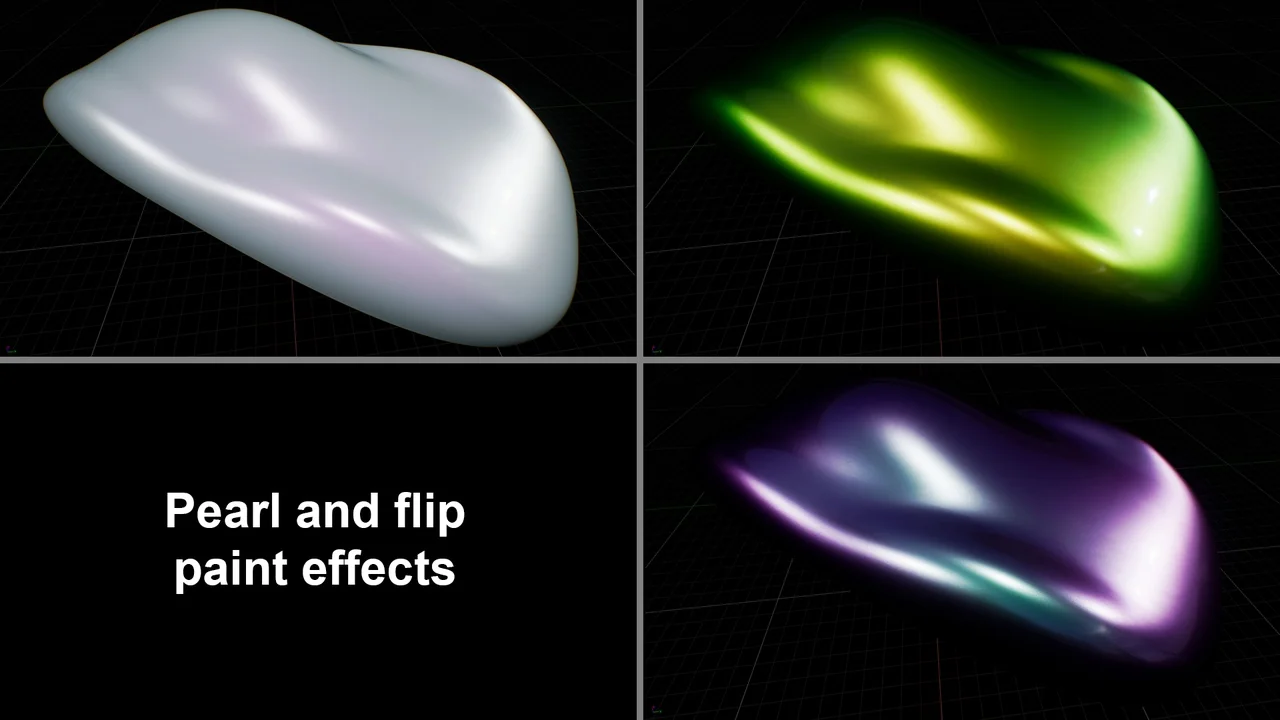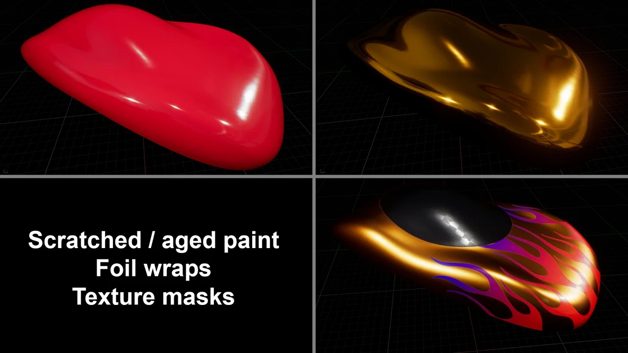 This master material allows for a wide range of creative outcomes. For instance, creators can produce multiple versions of carbon fiber, such as matte, gloss, or tinted finishes. Moreover, the system supports the creation of foil wraps and metallic paint. For more specialized looks, the material can simulate candy paint and flip or pearl paint effects. Users can also depict environmental wear through faded and scratched paint settings. This flexibility ensures that the Car Paint remains suitable for both new and used vehicle models.