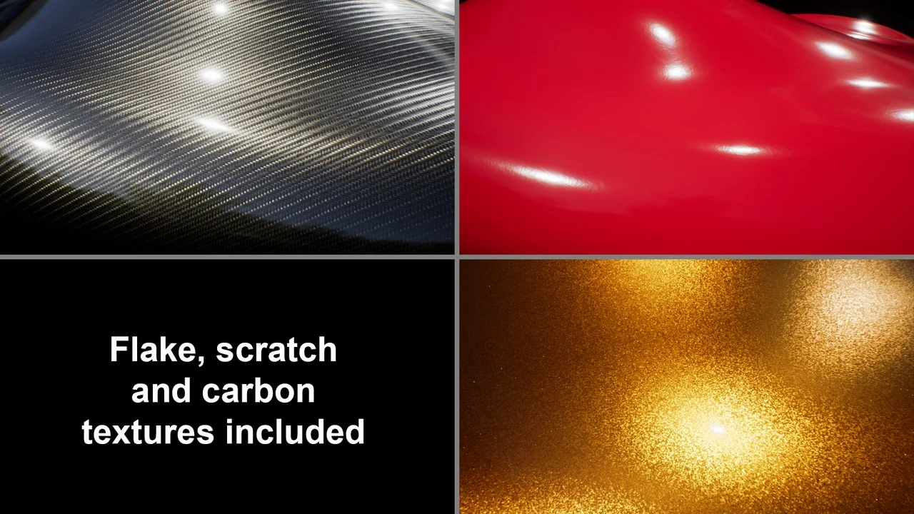 The package comes with several high-quality textures to enhance realism. These include dedicated maps for carbon fiber, metallic flakes, and clear coat scratches. Specifically, the metallic flake texture includes a dynamic sparkle effect. This effect reacts naturally as the camera perspective changes, mimicking real-world automotive paint. Additionally, the scratch textures help in creating aged or worn vehicle appearances. These details are essential for achieving a convincing Car Paint look in any lighting environment.