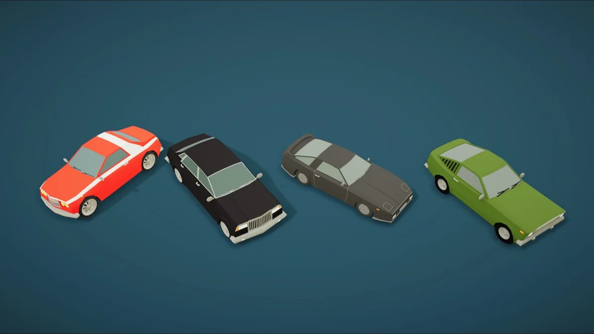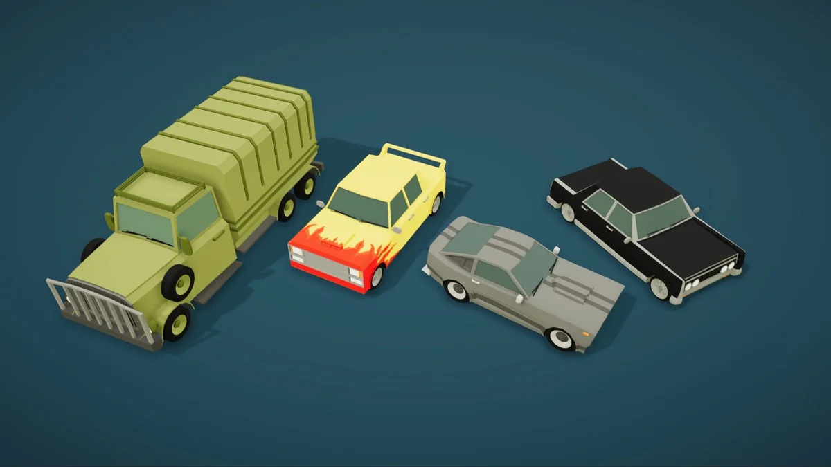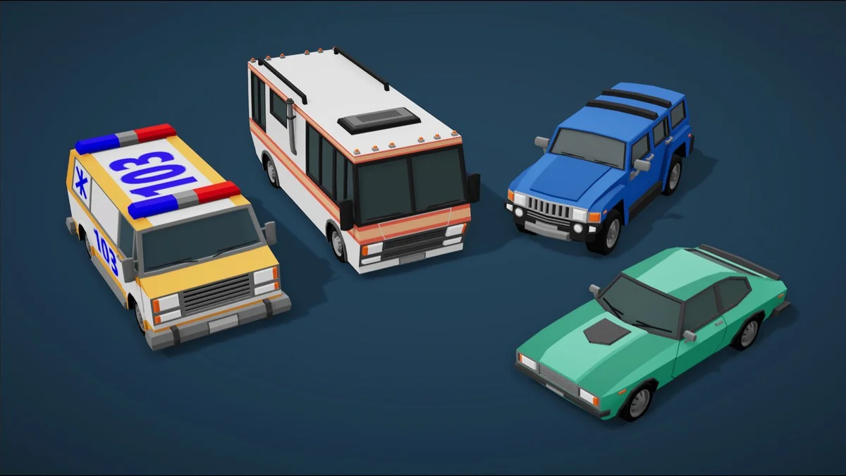The technical specifications of the models are tailored for performance-sensitive environments, particularly mobile platforms. The polygon counts range from 1,200 to 3,000 per vehicle, providing enough detail to maintain a clear, stylized silhouette while keeping the draw call overhead manageable. This range makes the assets versatile enough for high-density traffic systems on mobile devices while still looking clean on desktop and console hardware.