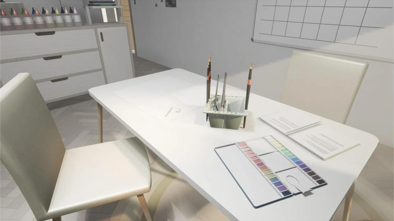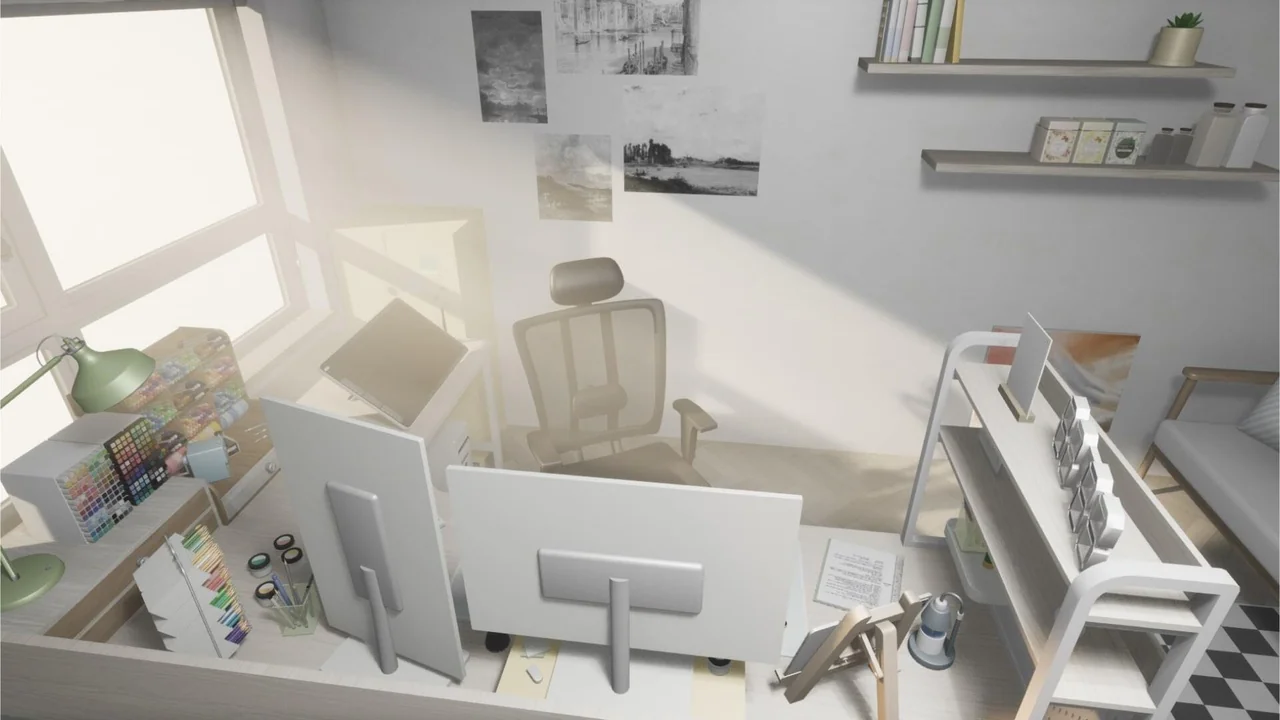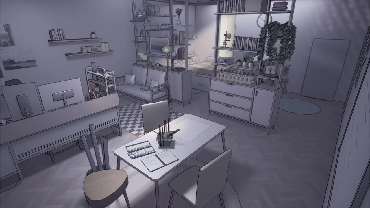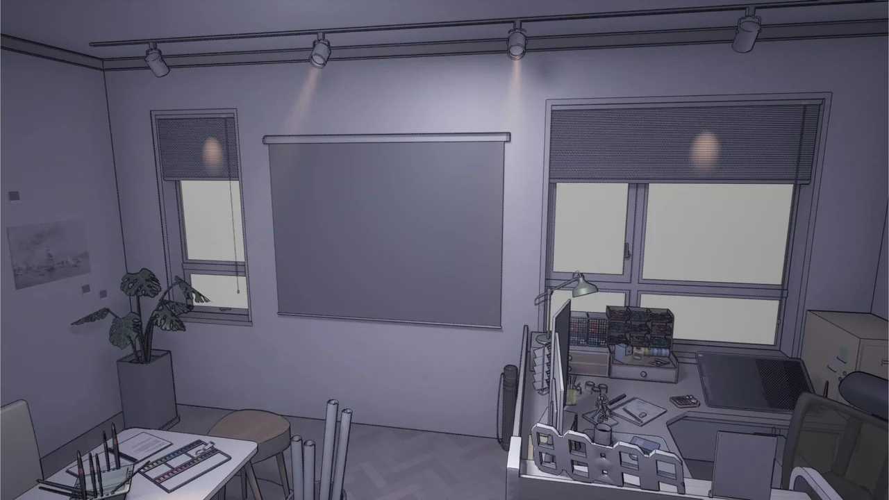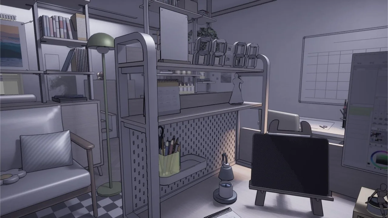 Specifically, the line material highlights the edges of furniture and tools. This makes every item in the room pop against the background. Meanwhile, the simple textures keep the scene from looking cluttered. Finally, this combination results in a highly readable and attractive game environment.