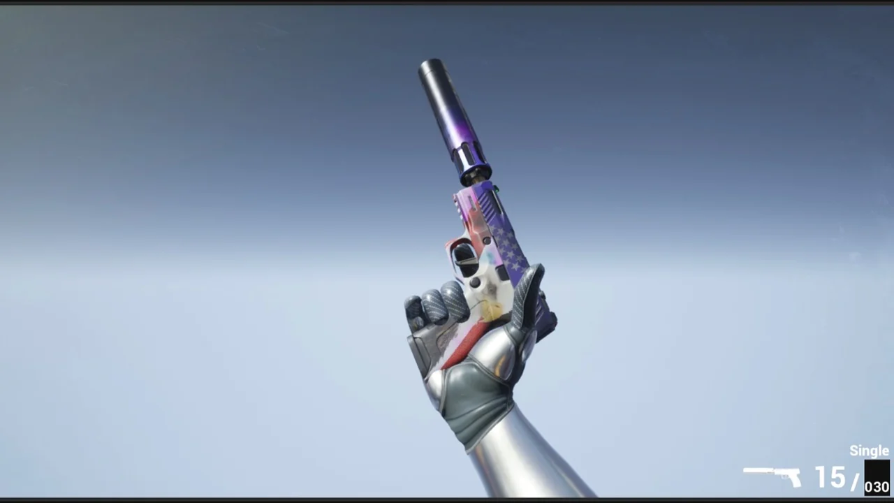 The handgun uses a material layering system, which allows different looks through patterns rather than forcing a single surface treatment. The weapon can also be recolored by changing only a tint. That gives the asset a straightforward way to support multiple visual styles while keeping the same underlying weapon setup.