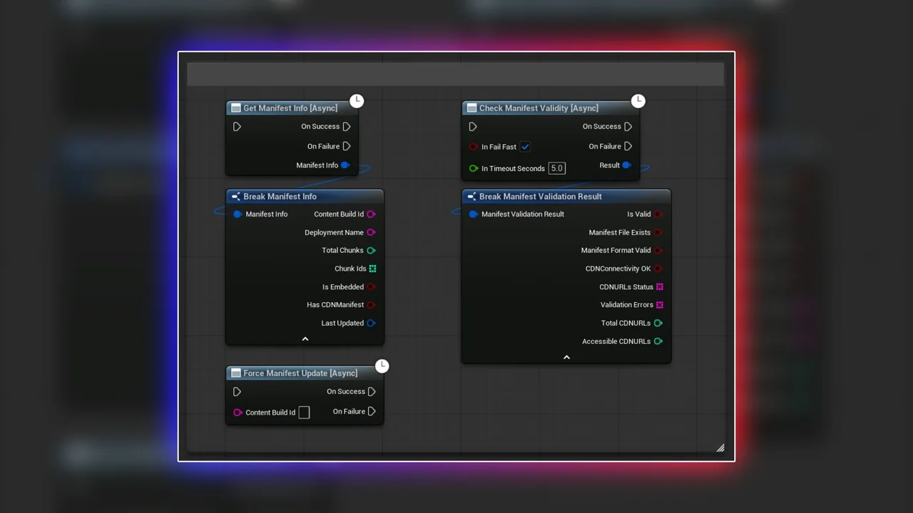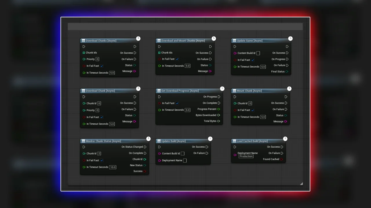 The timeout protection applies to seven specific async nodes. These include nodes for updating the game, downloading chunks, and checking manifest validity. Users can enable or disable this protection using a simple boolean input. Additionally, the default timeout is set to five seconds for quick error detection.