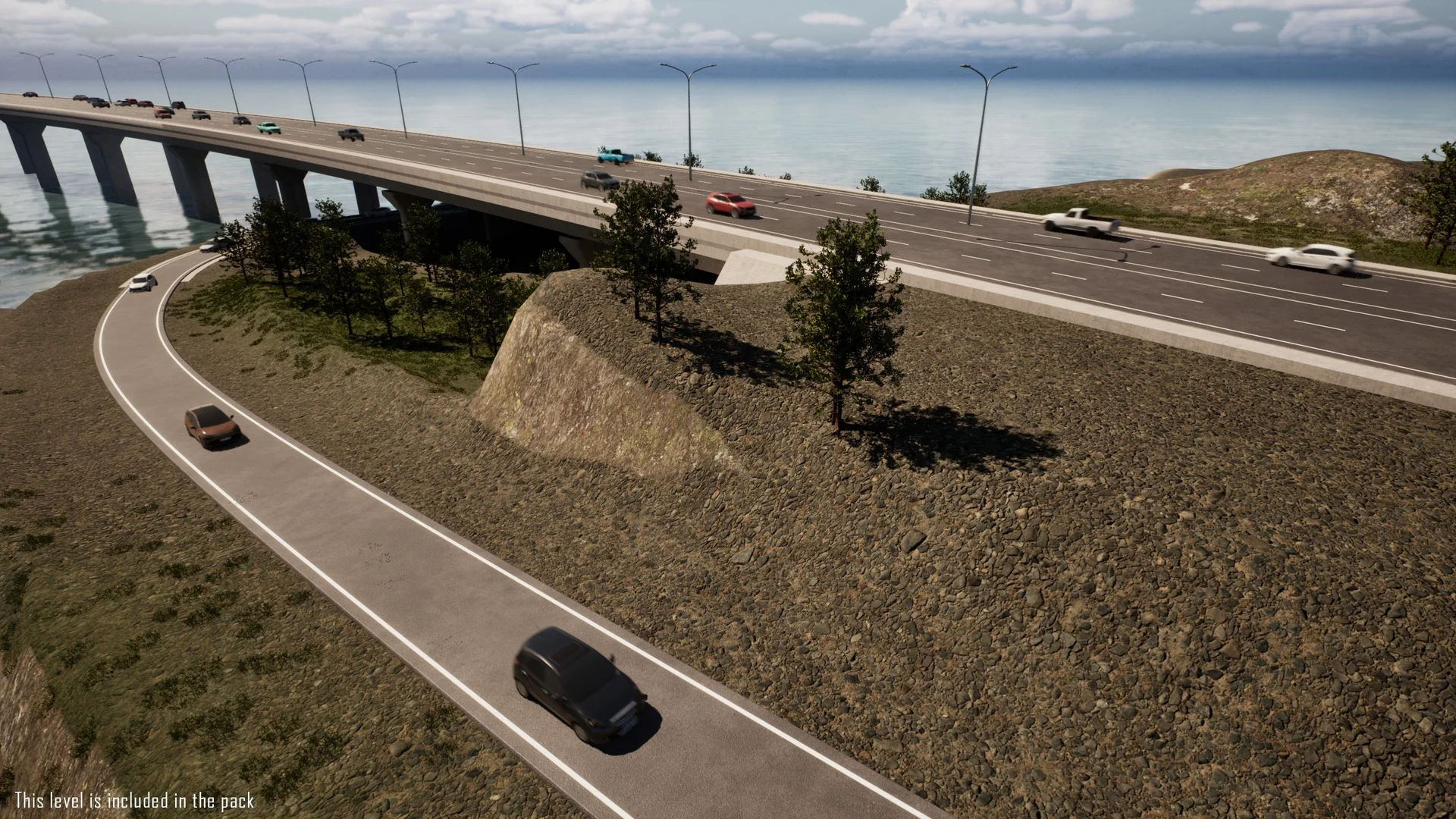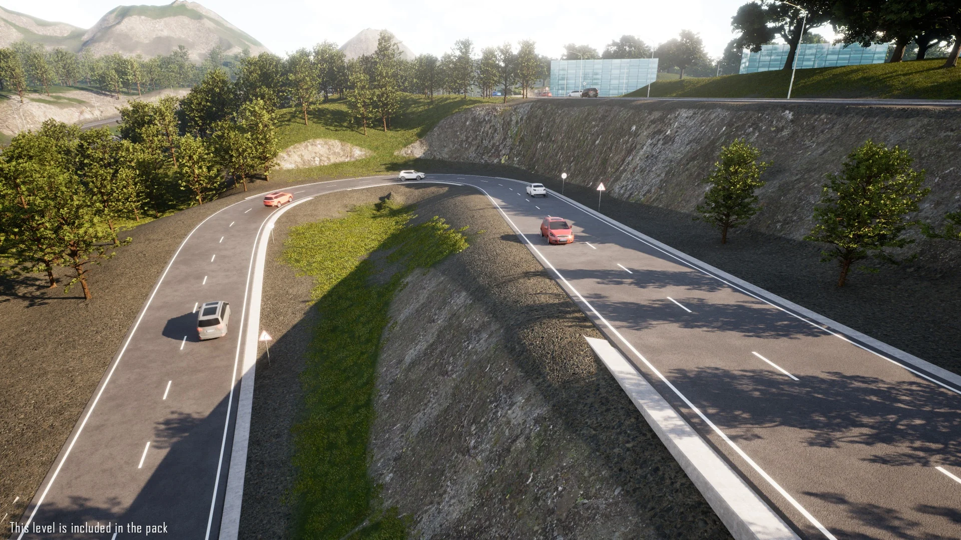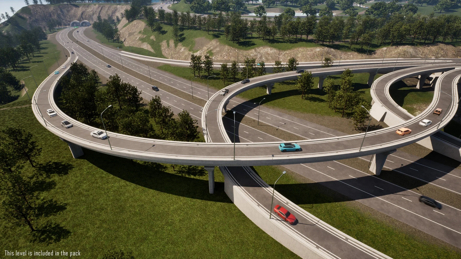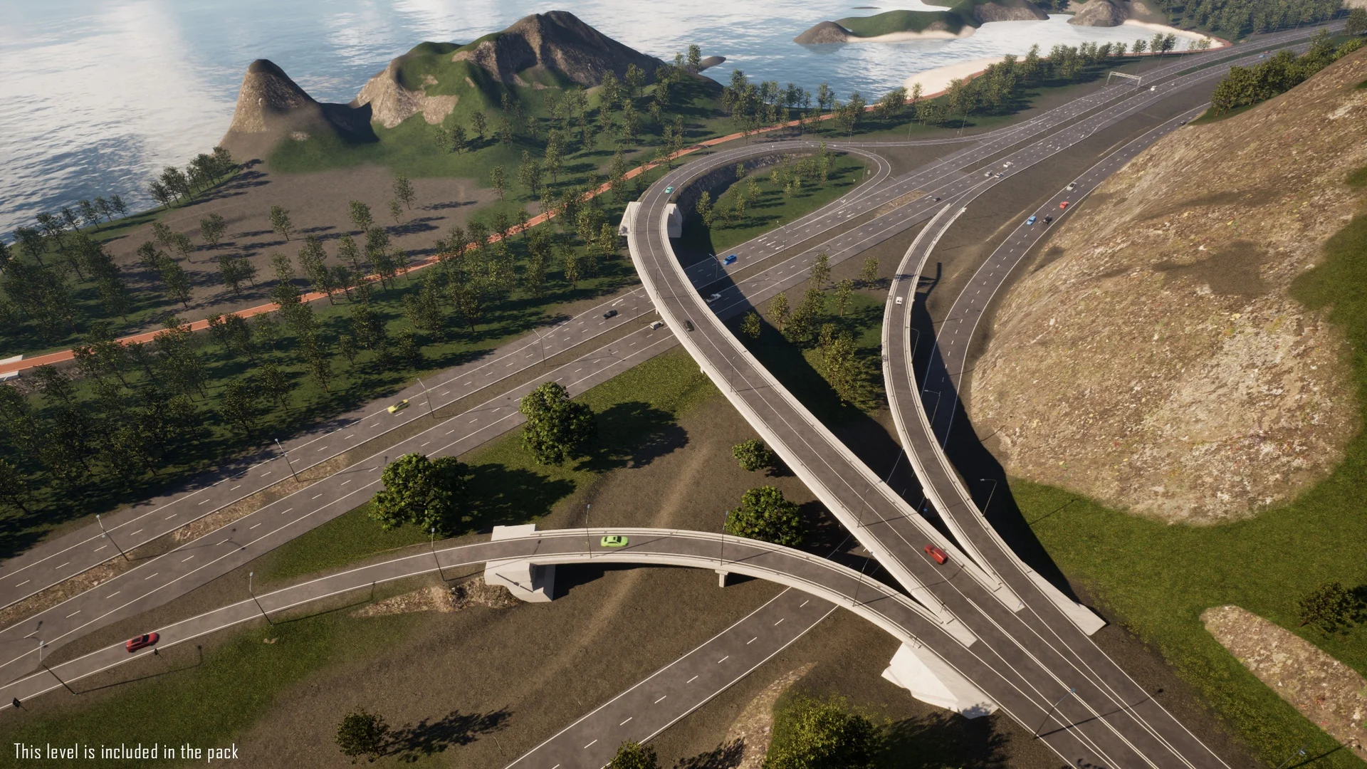 Additionally, the package includes “Road Creator Minimal,” a set of blueprints for building various road types. It also features a demo level with three pre-built cities showcasing European, American, and British traffic layouts.