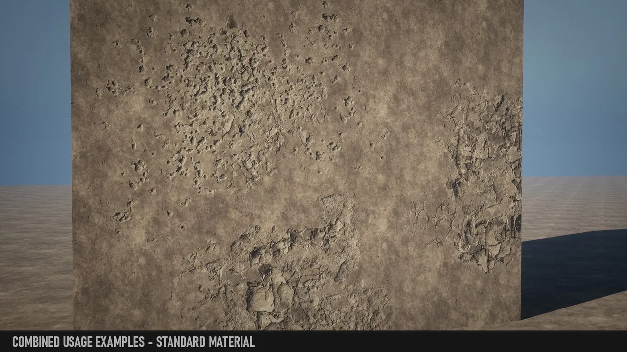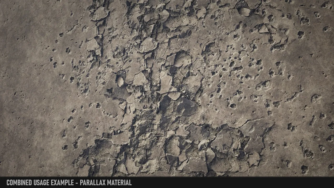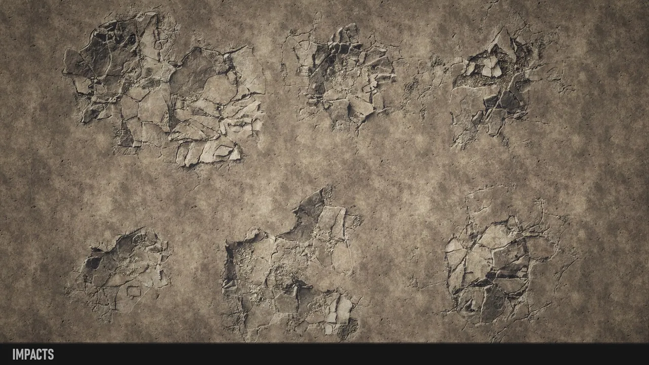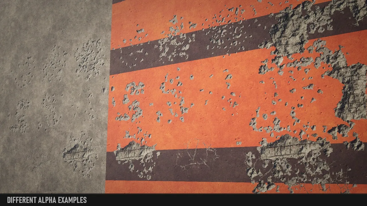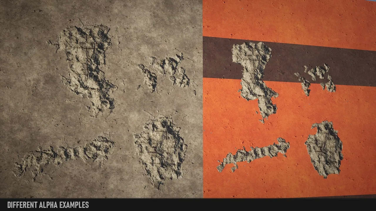 8 of the cracked decals, all bullet hole decals, and 1 mixed damage decal include alternate versions of the basecolour/alpha textures, which will allow them to easily fit on other concrete materials than the one provided. (see “Different Alpha Examples” screenshots)