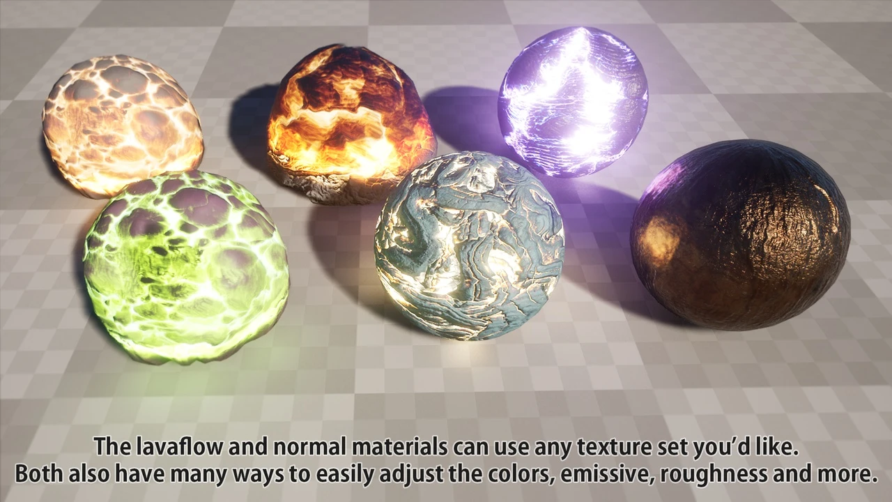 This set of materials and textures is built with a wide variety of platforms in mind. They can be used with or without the height map, emissive, animations, etc. The master materials and instances are all made so you can easily adjust them to fit your style.