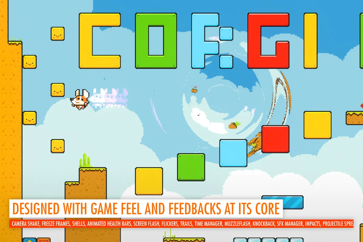 To address the nuances of game feel, the engine has MMFeedbacks built-in. This native integration allows for the rapid addition of surface feedbacks and visual cues without requiring external tools. These feedbacks can be triggered by nearly any action, from landing a jump to taking damage, helping to ground the character in the world and provide immediate response to player input.
