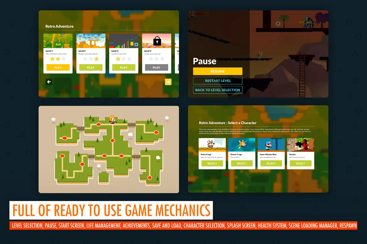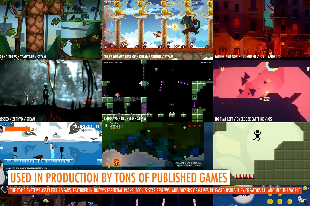 The package is not merely a collection of scripts but a full production environment. It includes over 50 handcrafted demo levels that showcase different genres and configurations of the engine. These levels serve as both functional templates and educational resources for understanding how to structure complex 2D environments. To facilitate rapid prototyping and final production, the asset includes more than 300 visual assets that are ready for use in commercial projects, rather than being simple placeholder graphics.