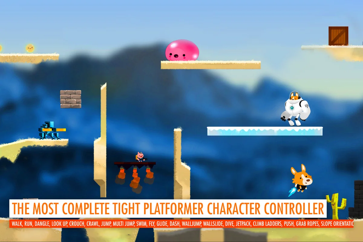 The engine is built around a modular ability system that covers a wide spectrum of traditional and modern platformer mechanics. Standard traversal options include walking, running, crouching, and looking up or down, but the system extends significantly into specialized movement. For verticality, the engine supports ladders, ledge hanging, ledge pulling, and dangling. It also includes complex jump mechanics, such as wall jumps in the style of Super Mario Run, double jumps, and the ability to configure an infinite number of additional jumps.