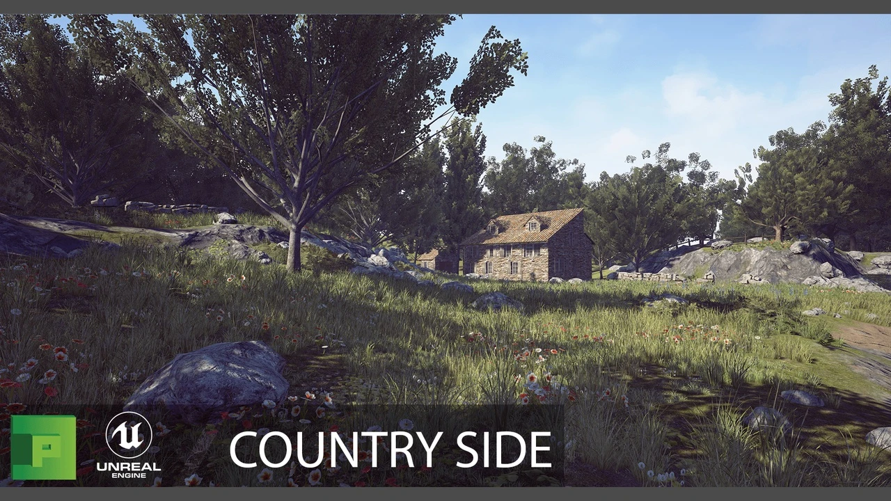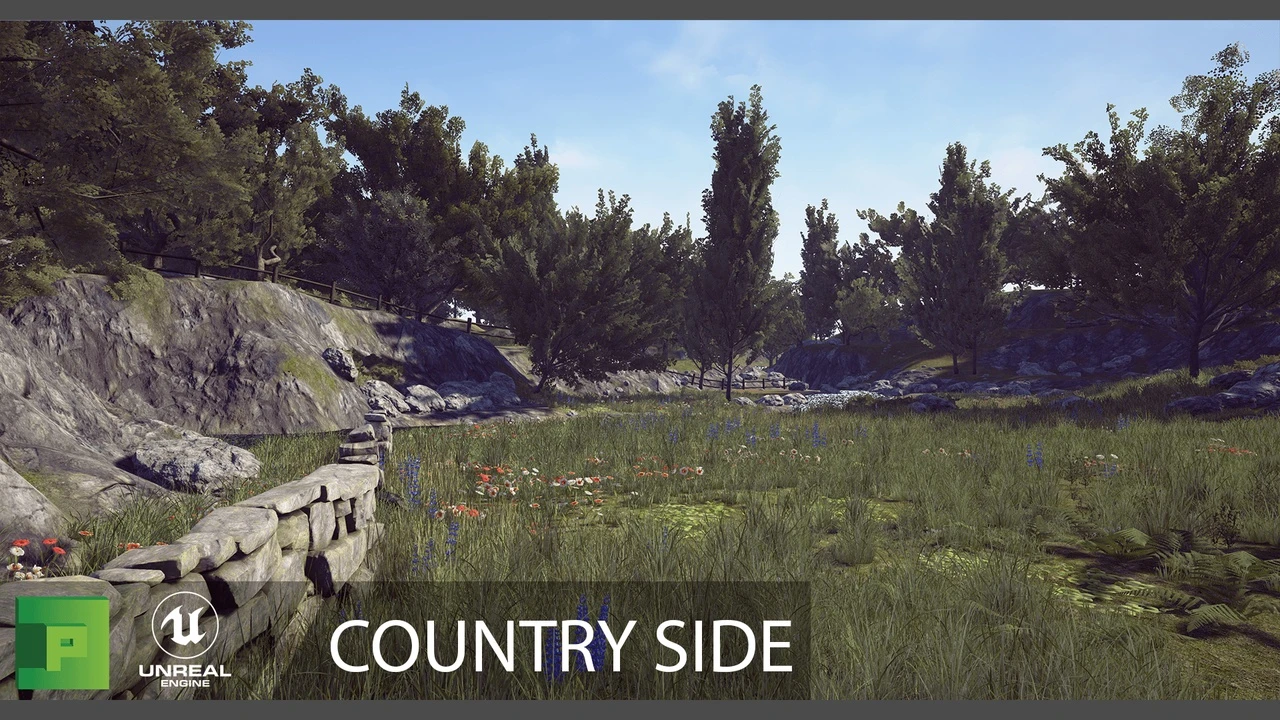 Country Side package is intended to be a quick start to a foliage pack for just about any scene you need. With versatile trees, grass, rocks, terrain, all hooked up to latest UE4 standards (both desktop and mobile assets), it is just a drag and drop into your scene to get it working.Each asset is optimized with full LODs, no wasted texture space, clean materials, to insure this runs as smoothly as possible. Advanced, but simplified, materials. These shaders are getting the most out of all the great UE4 shader properties, but built in a clean and thorough manner so just about any level of shader artist can pick up easily. All assets are fitted with unreal wind to bring life into the world. This pack comes with 2 identical environments, but set during fall and summer months, so showcase the diversity of the assets.