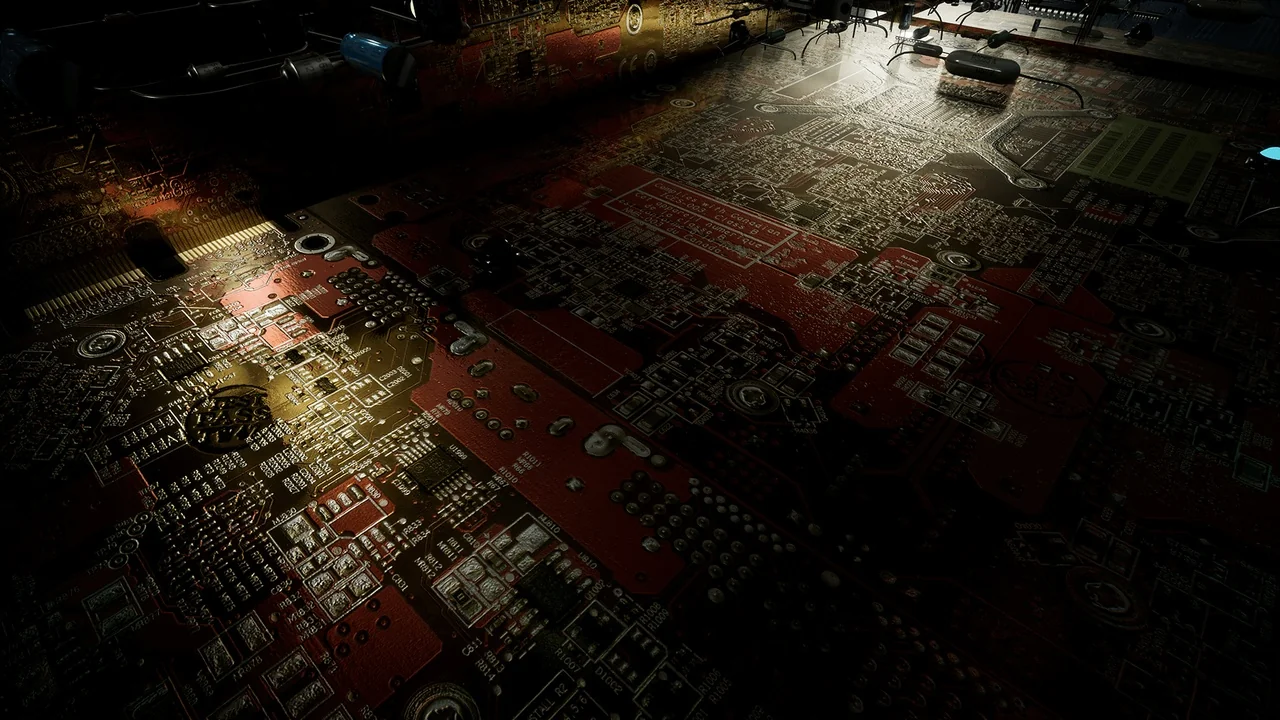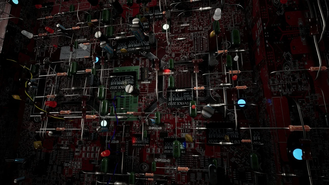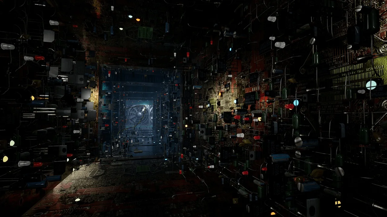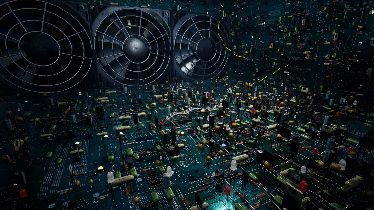 That scale shift changes how the environment reads. The components stop feeling like isolated props and start acting as terrain, while the chip walls give the space a structured, mechanical edge. The result is a compact world that keeps the language of computers and electrical hardware visible at every turn.