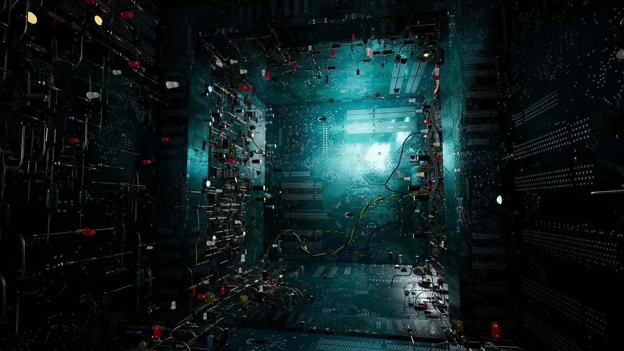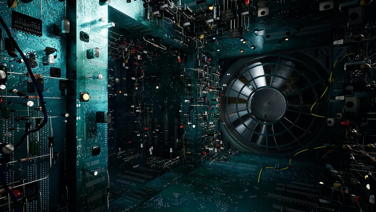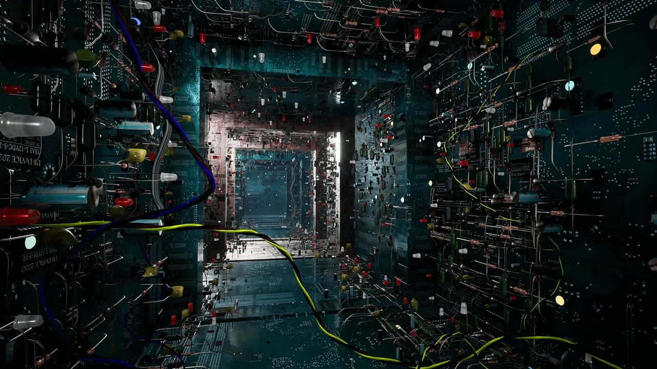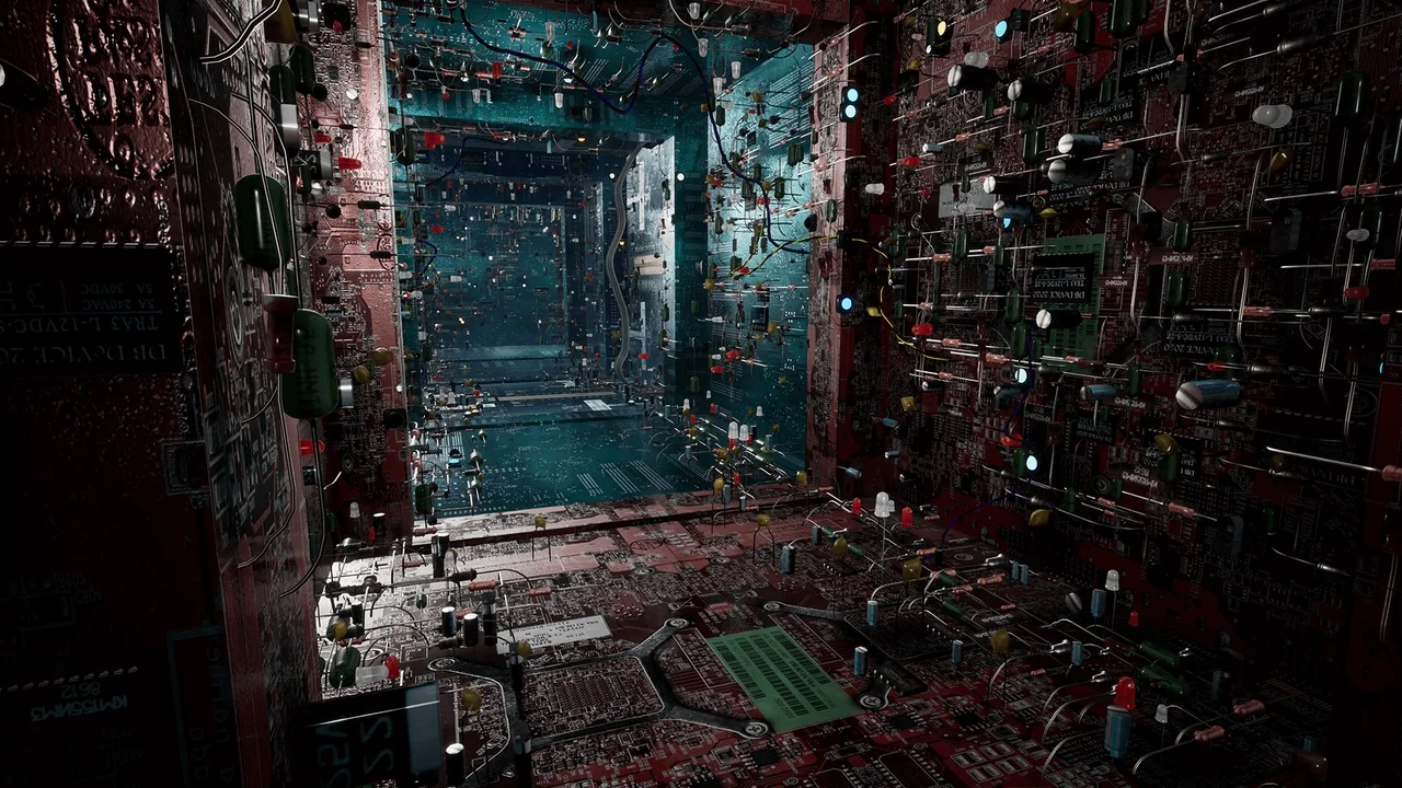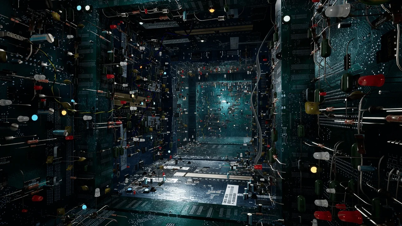 That scale shift changes how the environment reads. The components stop feeling like isolated props and start acting as terrain, while the chip walls give the space a structured, mechanical edge. The result is a compact world that keeps the language of computers and electrical hardware visible at every turn.
