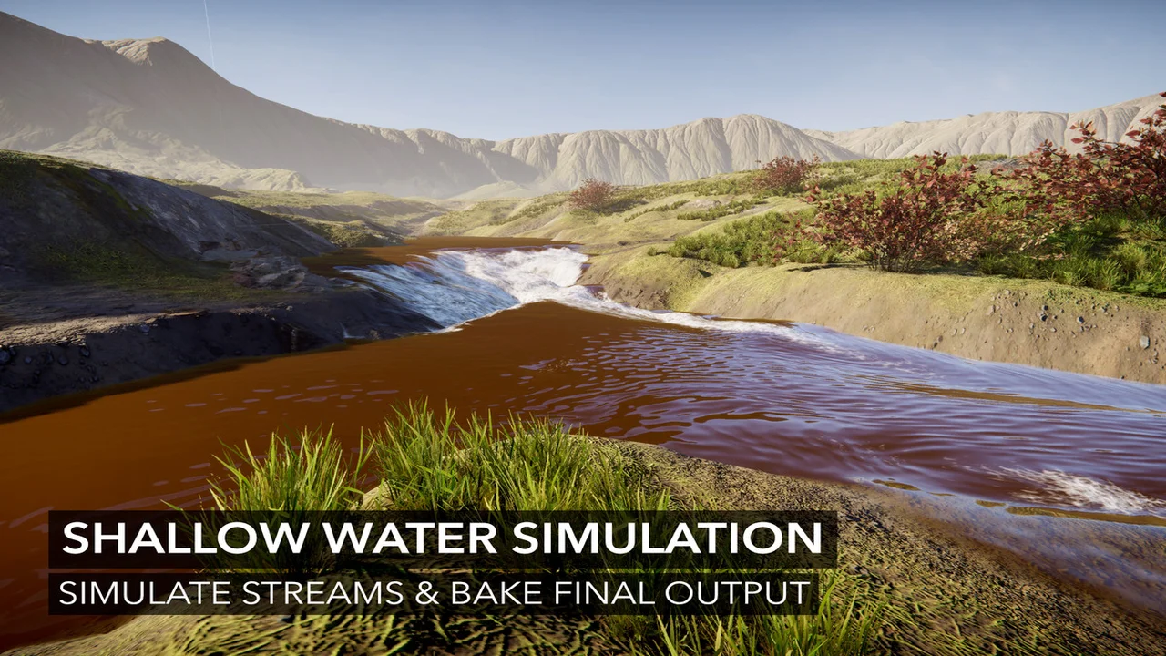When simulating shorelines, the simulation can static or follow the camera. When simulating streams, the final output can be baked to a texture for fantastic performance.