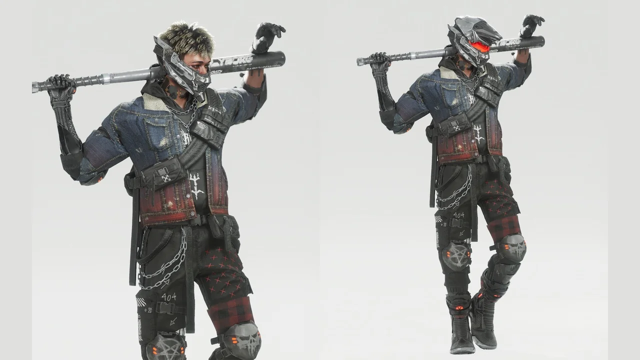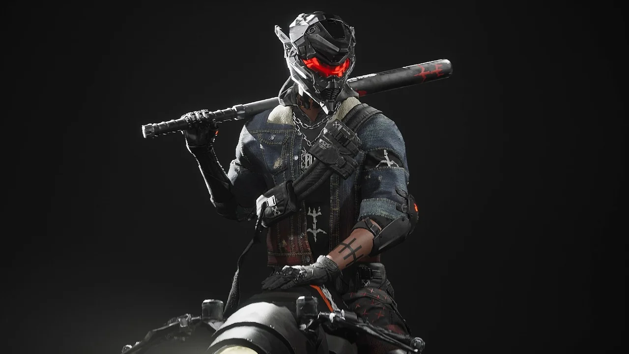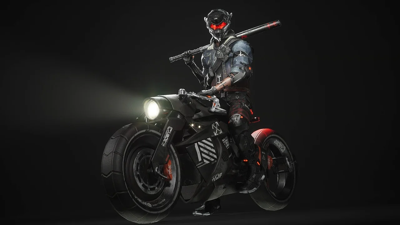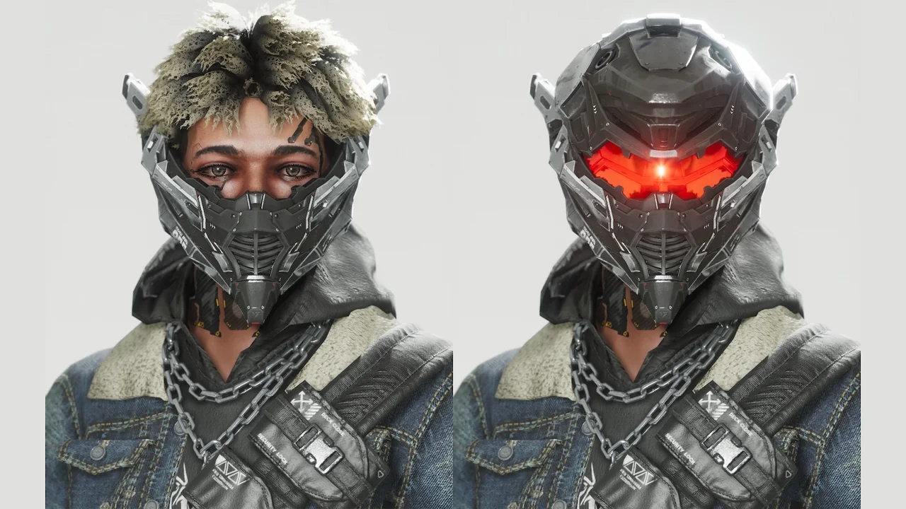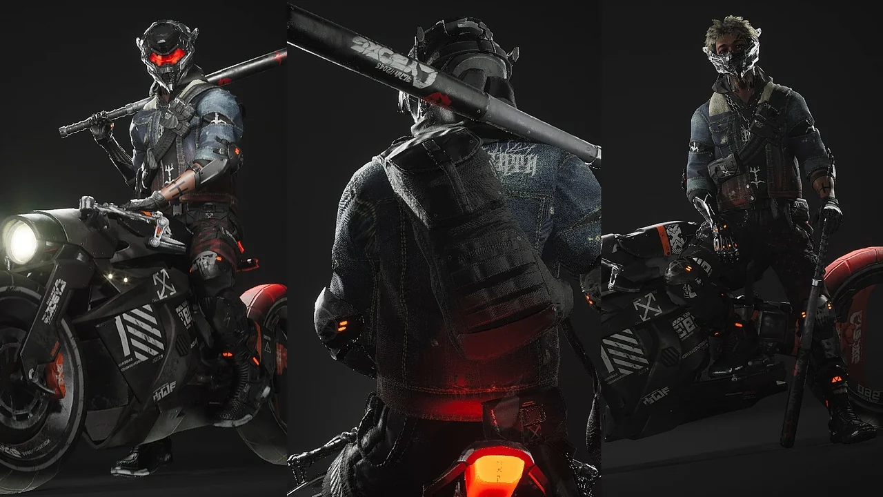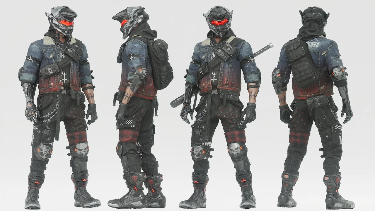 The character features a distinct biker influence. This is combined with metalhead and mecha elements. For example, the clothing includes realistic denim textures. These are paired with advanced mechanical parts on the head and body.