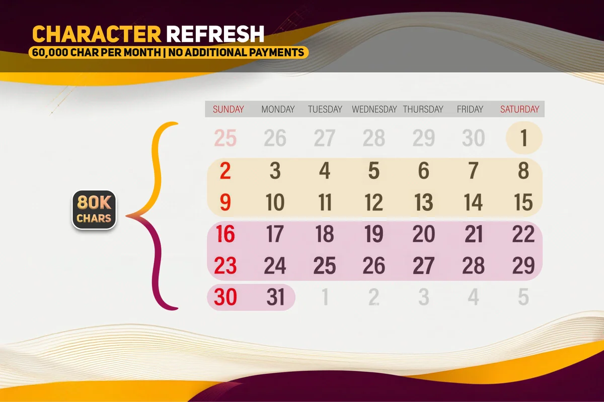 The asset operates on a monthly character quota system that resets on the 1st of every month. The current allotment allows for 80,000 characters per month, which the developer equates to approximately 24 pages of 12-point text. This capacity is intended for significant amounts of voice-over and narration. Recent updates have also improved processing speeds, allowing the tool to handle up to 2.5 times more characters at a single time during the generation process.