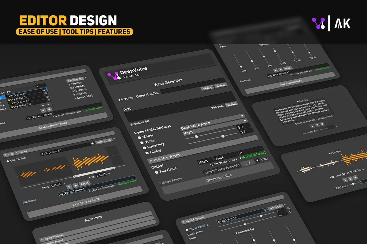 DeepVoice is a collection of Text-to-Speech (TTS) models designed specifically for the Unity environment. Using deep learning, the tool generates life-like voice performances directly from text inputs. It is built to function within the Unity Editor in both Edit Mode and Play Mode, allowing developers to generate and test audio assets without leaving their project environment. The system operates via a beginner-friendly GUI, removing the necessity for custom coding to generate or implement narration.